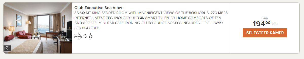 Twee nachten voor € 230,00 in een Junior Suite is een prima prijs, zeker als Club Lounge toegang inbegrepen is. Bij de meeste vergelijkbare hotels (Hilton Istanbul Bosphorus en Conrad Istanbul Bosphorus) zou ik ongeveer hetzelfde kwijt zijn voor de goedkoopste kamer.