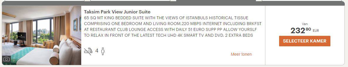 Normaliter kost een kamer bij Intercontinental Istanbul € 116,40 per nacht. Je krijgt daarvoor een kamer van 32 vierkante meter. Ontbijt is bij deze prijs niet inbegrepen.