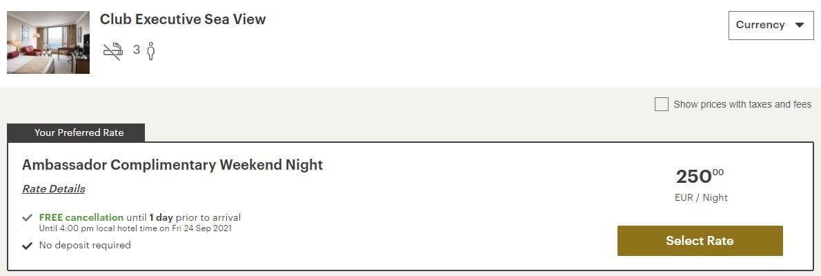 Om gebruik te kunnen maken van de gratis weekend nacht moet je het meest flexibele tarief boeken. De door mij gewenste Club Kamer met zeezicht kost in dat geval € 250,00.