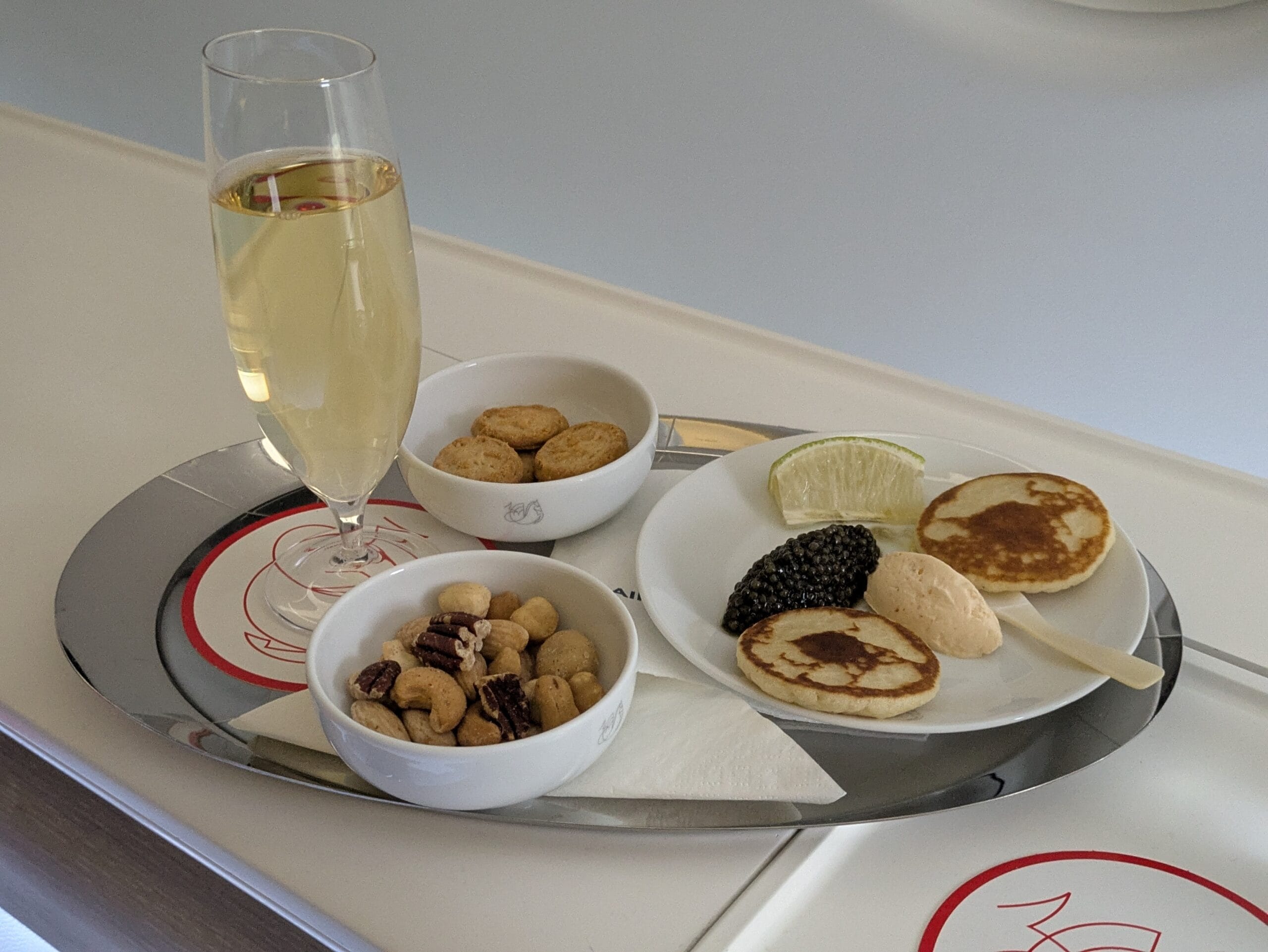 De catering is uitstekend. Je treft geen drie soorten champagne aan, maar in plaats daarvan is er een roterend aanbod. Over het algemeen een uitstekende champagne. Het eten is – net als in de lounge – uitstekend. Vanuit Parijs serveert Air France altijd kaviaar.