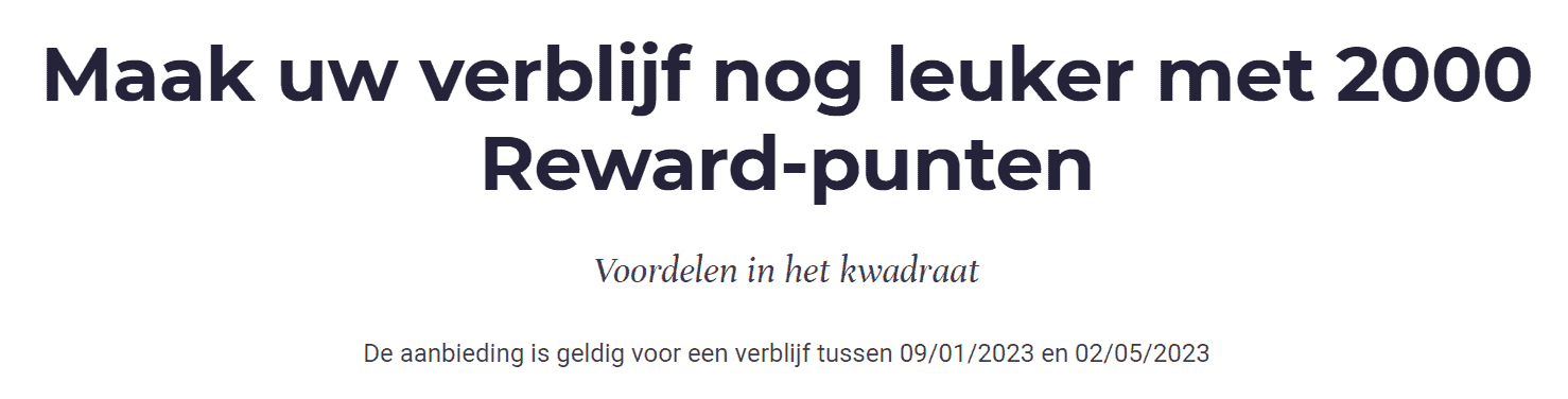 In de eerste maanden van 2023 kun je eenvoudig 2000 bonuspunten verdienen. Deze 2000 bonuspunten hebben een waarde van € 40,00. Je kunt deze vervolgens inzetten bij een volgend verblijf bij één van de deelnemende Accor ALL hotels, bijvoorbeeld als korting op de eindnota.