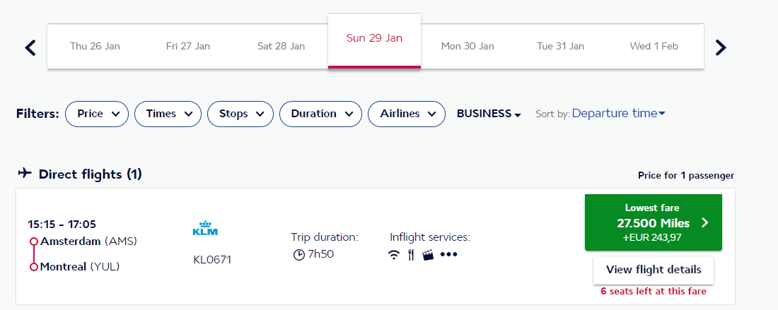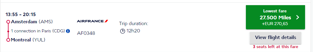 Een prima promotie: voor 27.500 miles in Business Class naar Canada is echt prima. Je kunt kiezen uit het gemak van een rechtstreekste vlucht of een moderner toestel met een tussenstop in Parijs. De toeslagen zijn wel relatief hoog, maar niet extreem. Voor iets meer miles (43.500) kun je ook naar Toronto vliegen in Business Class: een nette prijs.