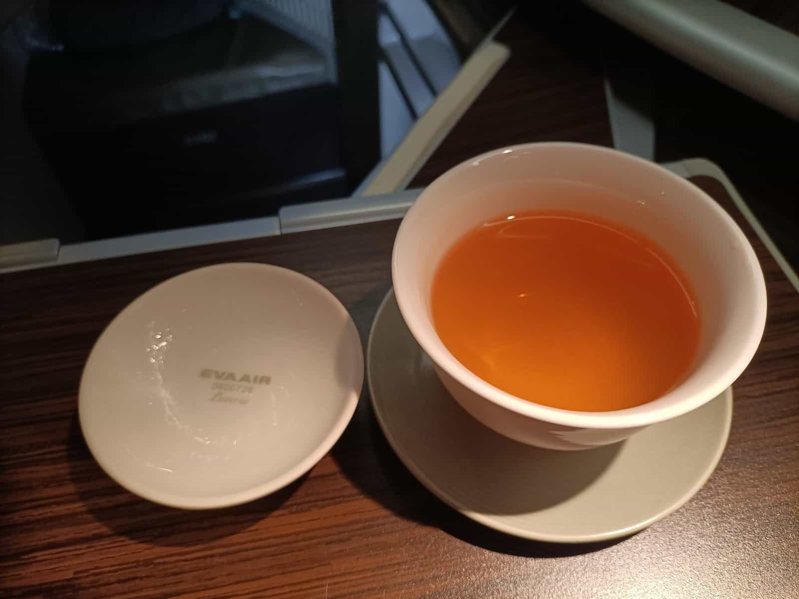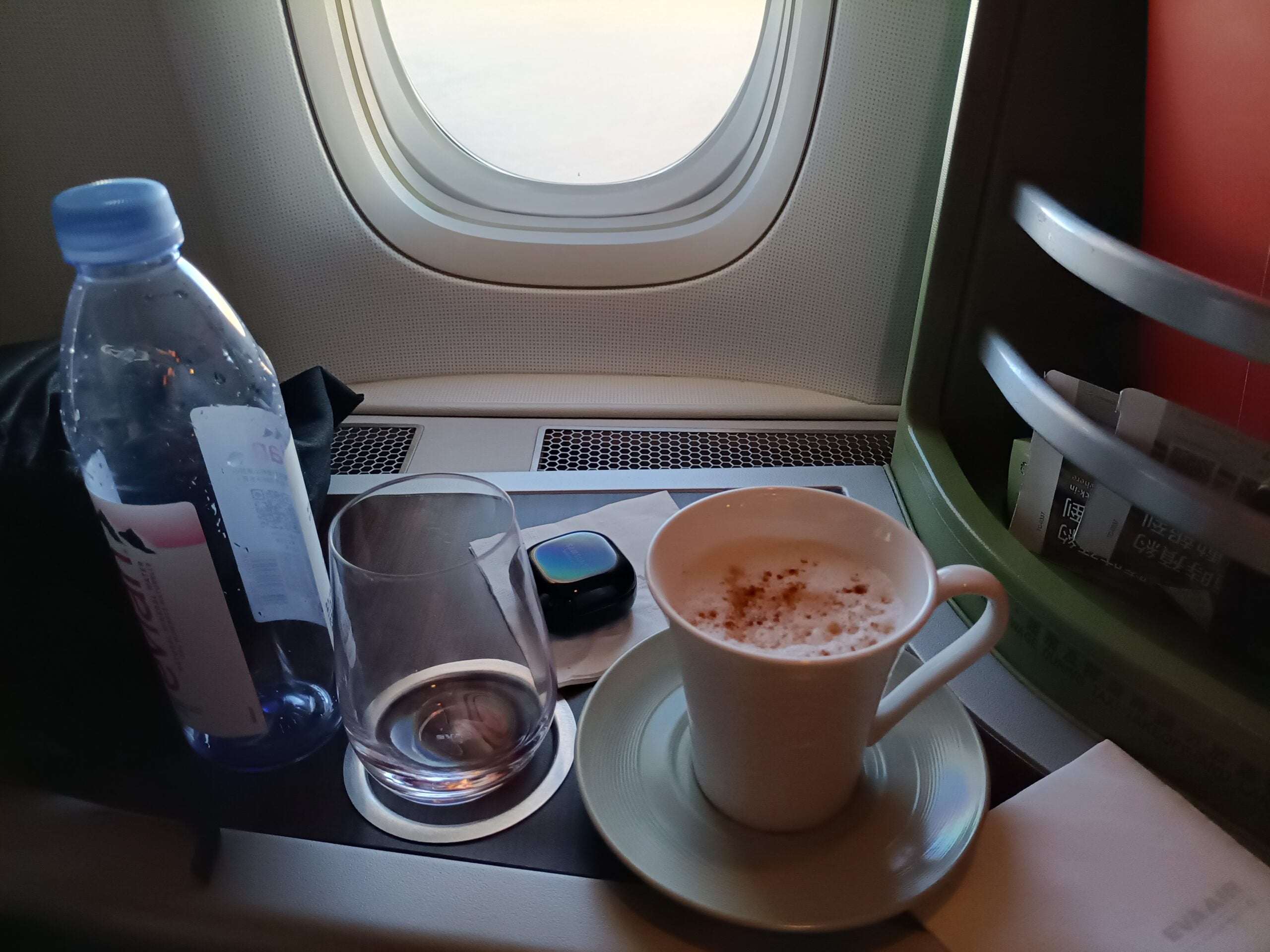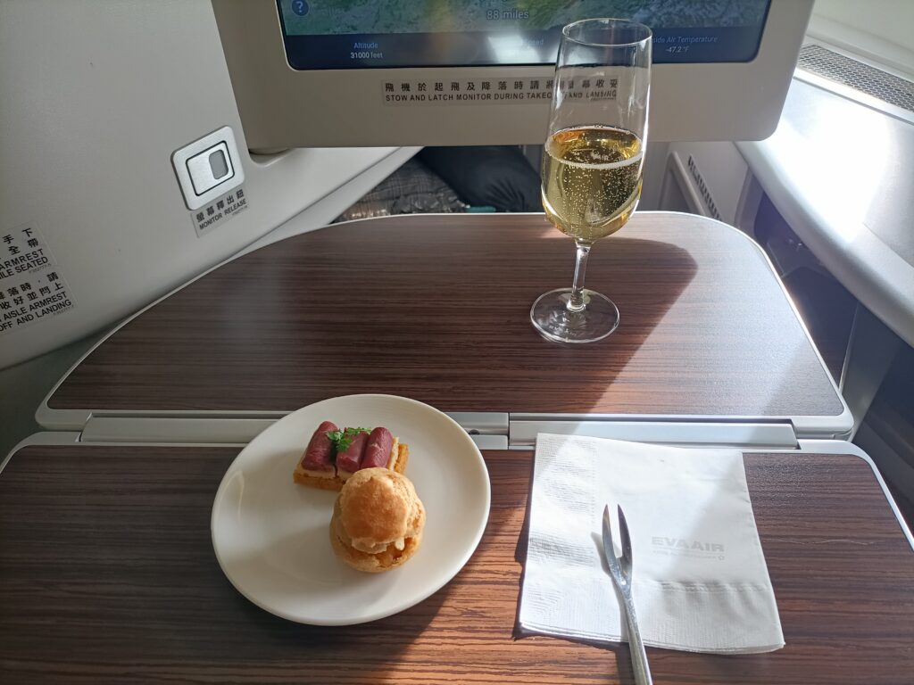 De service moet even op gang komen na de take-off. Eerst is het tijd voor de prelude met een glas champagne! De champagne op deze vlucht is Duval Leroy Clos des Bouveries 2007. Tot ongeveer een halve maand geleden serveerde EVA Air Laurent Perrier Grand Siecle op deze route, wat nog een flinke stap hoger is. Desondanks is dit een uitstekende Business Class champagne.