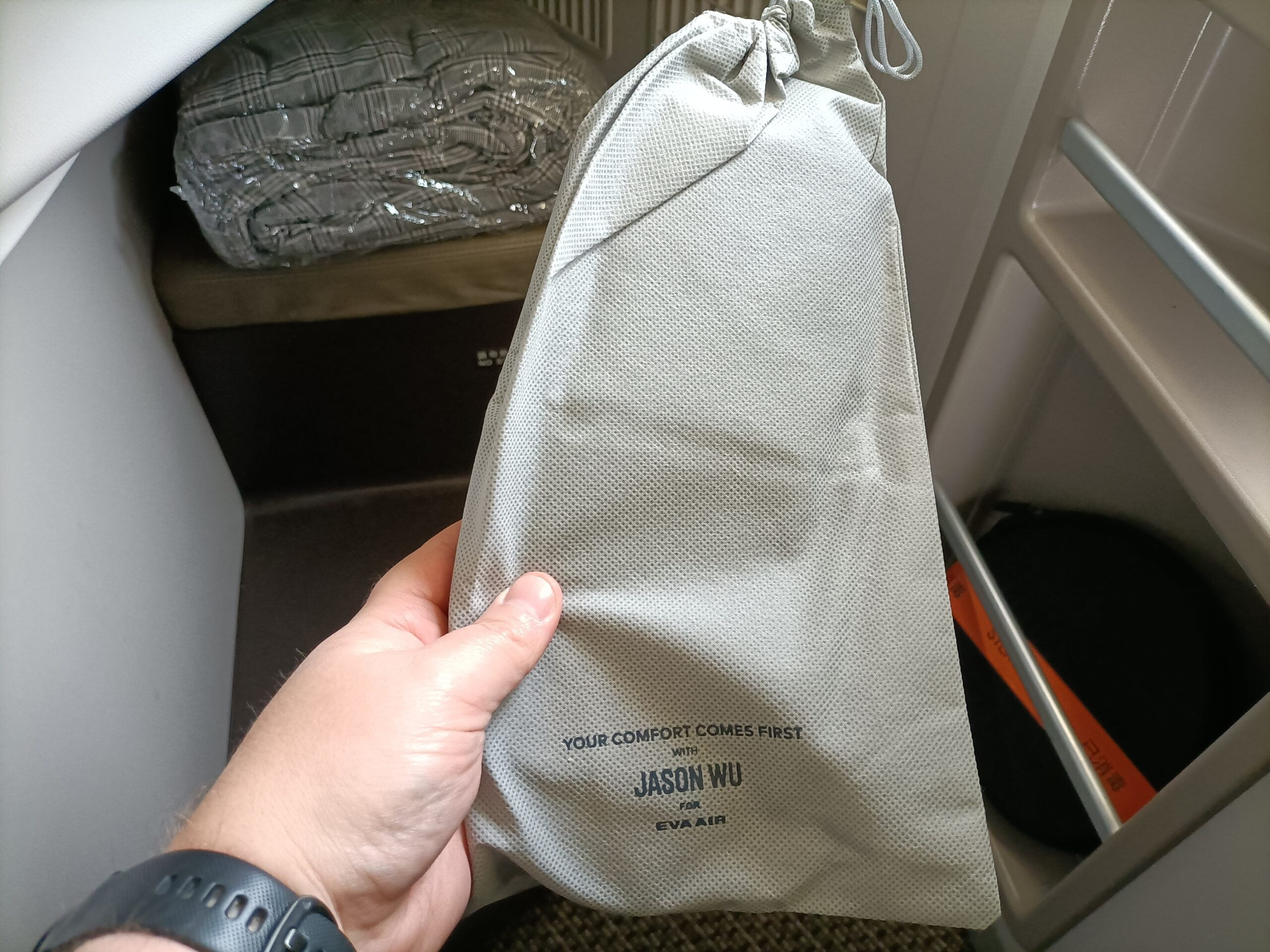 Slippers van Jason Wu worden uitgereikt. Deze zijn – zeker voor Business Class! – van hoge kwaliteit.