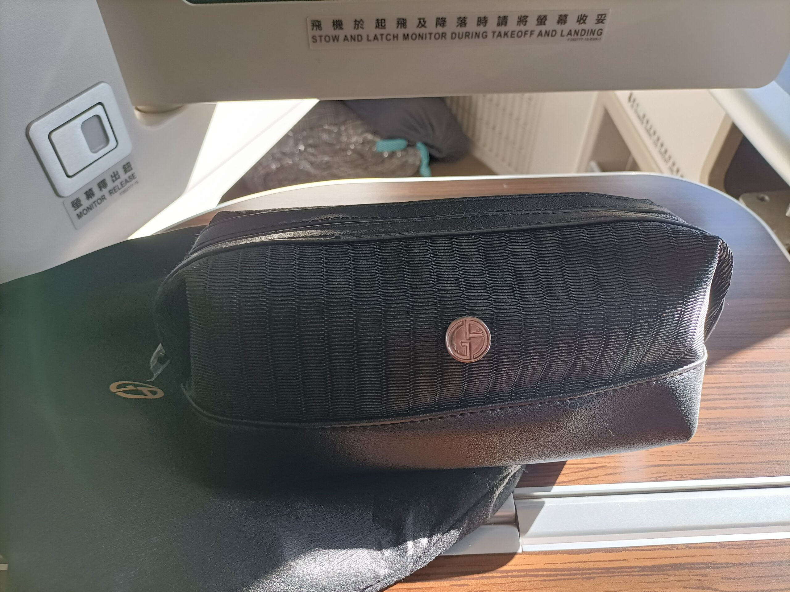 Na de maaltijd is het tijd om de amenity kit eens te bekijken. Deze Giorgio Armani amenity kit zit in een tas.