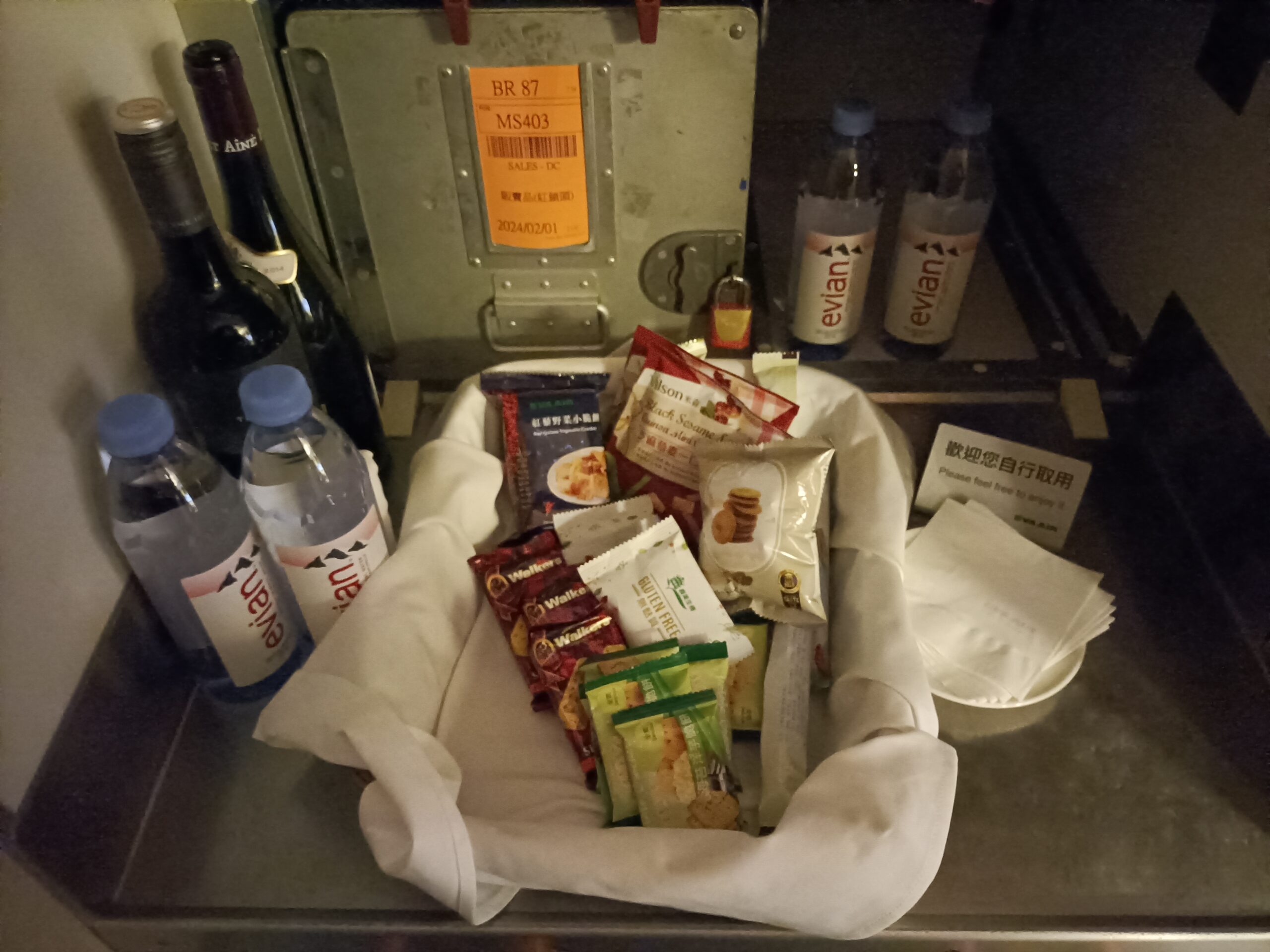 In de galley is opstelling met snacks, flessen water, wijn, etc. Vanzelfsprekend kun je daarnaast ieder gewenst drankje bestellen. Ook zijn er een aantal warme snacks te bestellen, zoals Noodles.