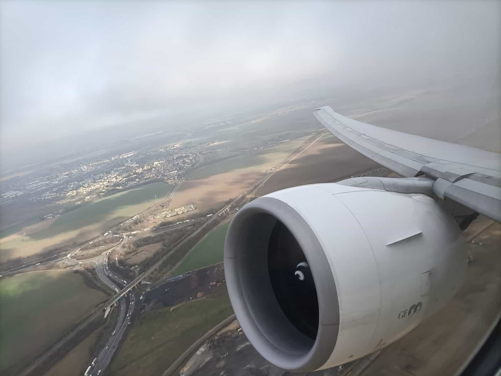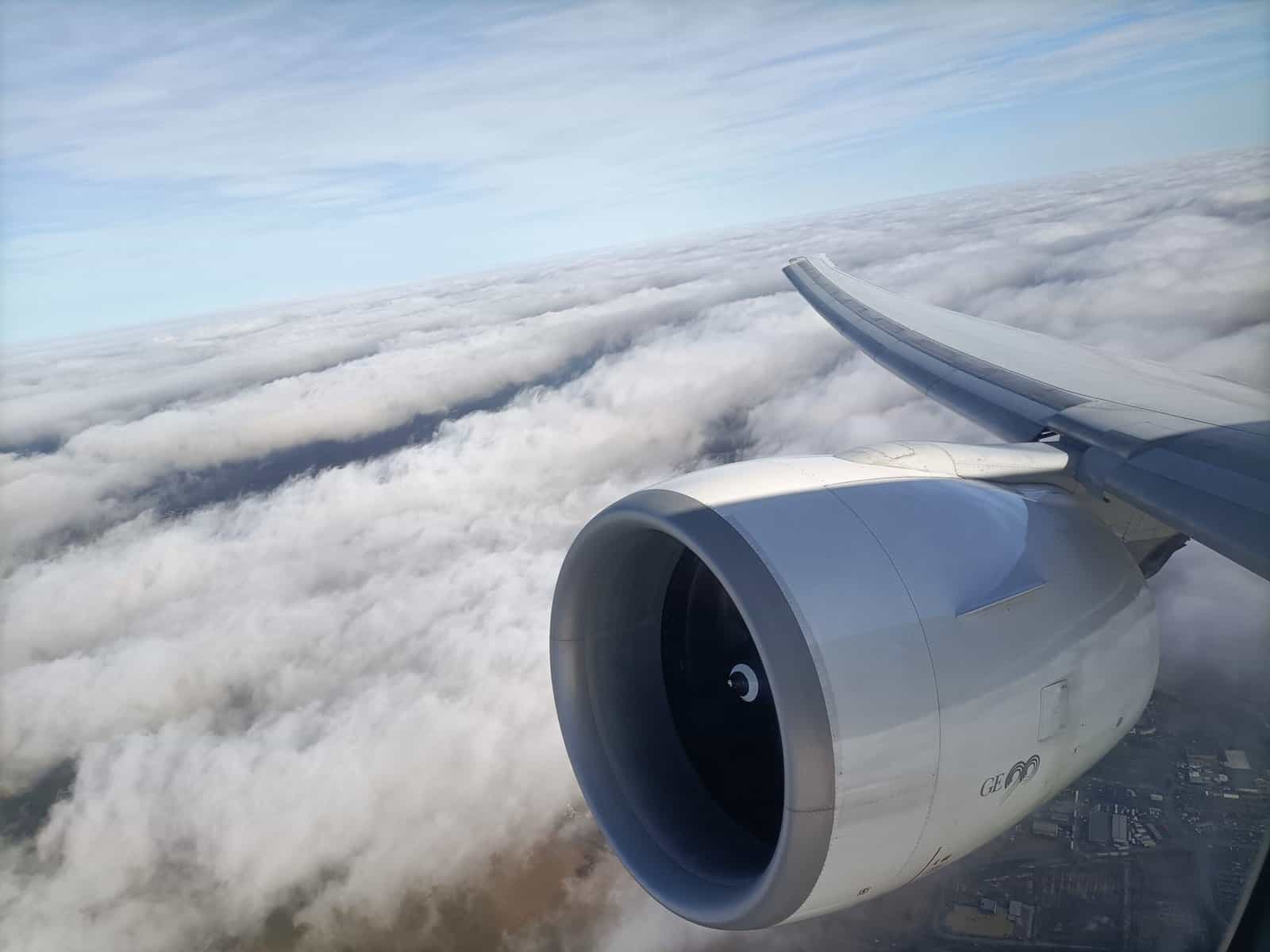 Het opstijgen is een genot, vooral dankzij de enorm krachtige General Electric motoren van de Boeing 777.
