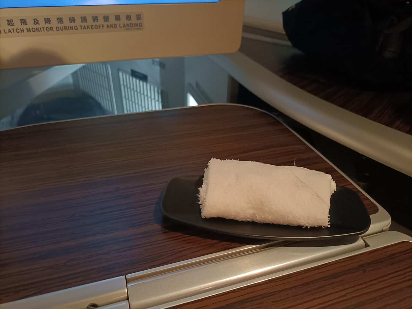 Ik kies in dit geval voor water. Naast het welkomstdrankje krijg ik een heet verfrissingsdoekje.