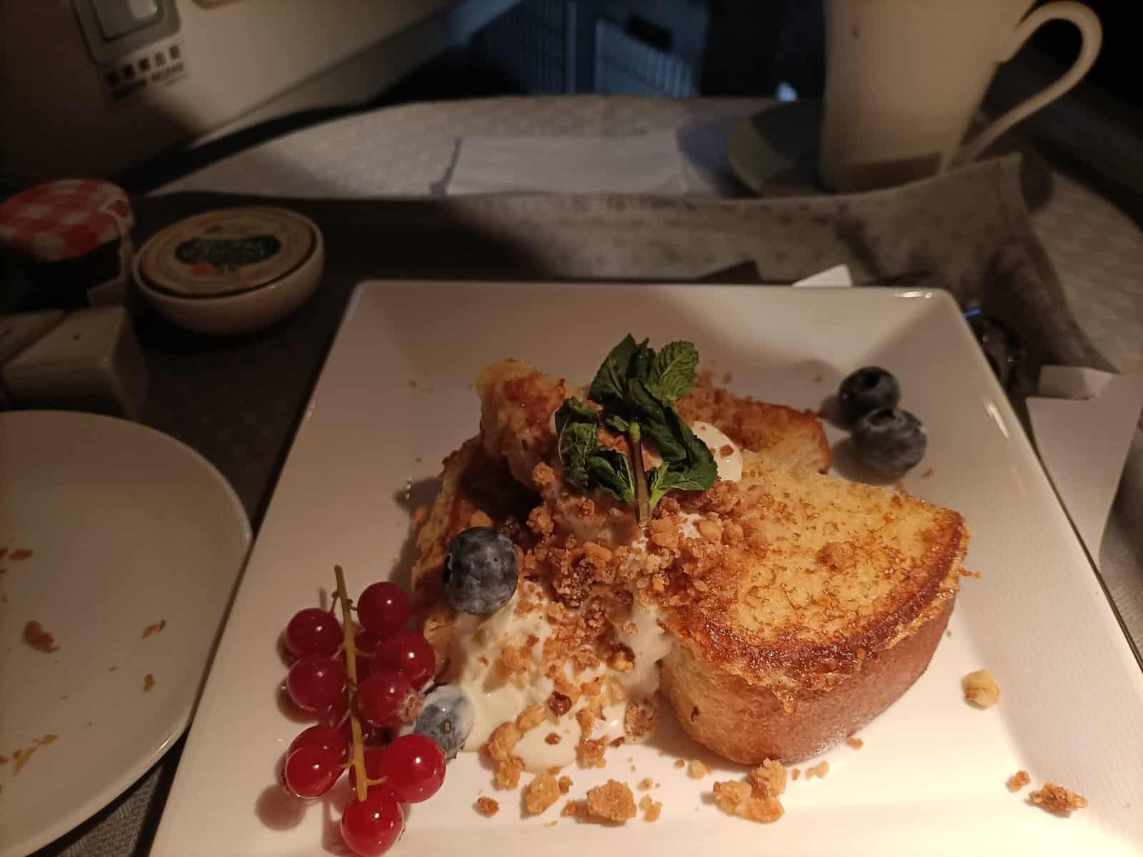 Helaas pakt het slapen – zoals wel vaker – niet goed uit op deze vlucht. Ik besluit dan ook maar om een film te zien. Voor de landing volgt nog een ontbijt. Uiteraard begint de ontbijtservice met een heet doekje.