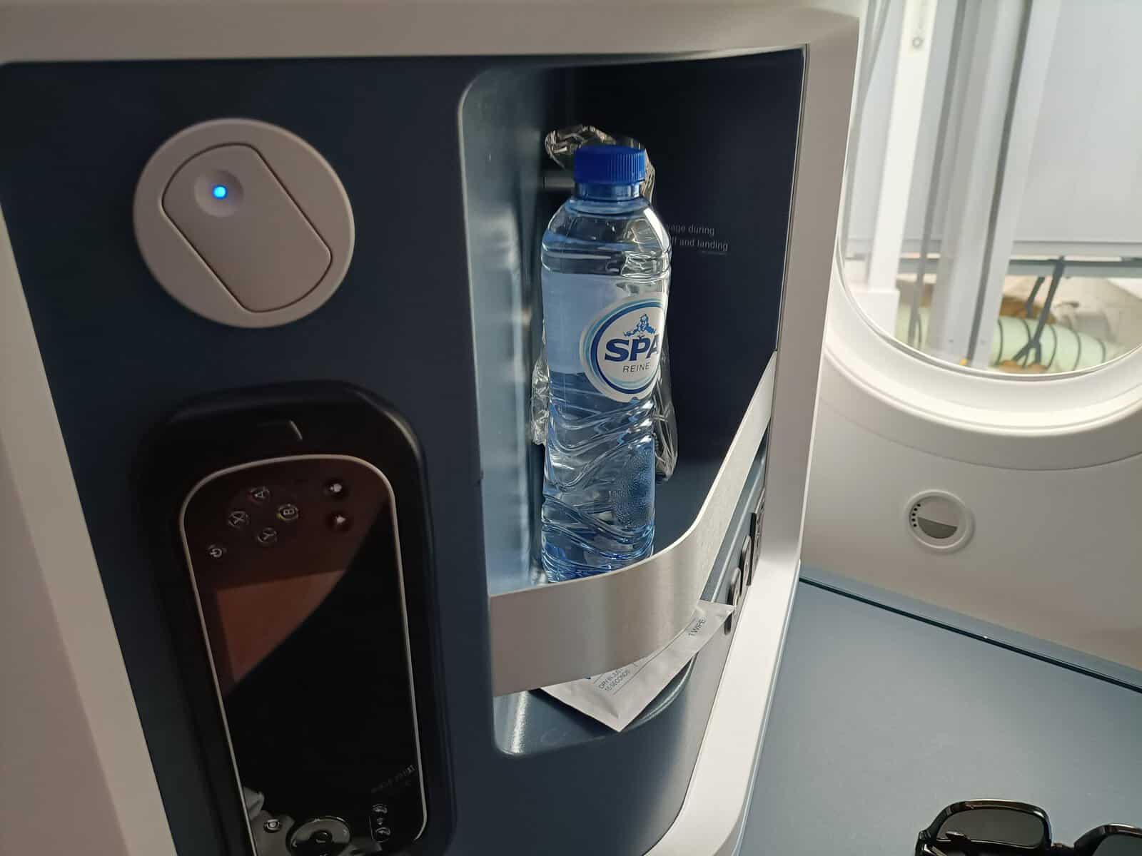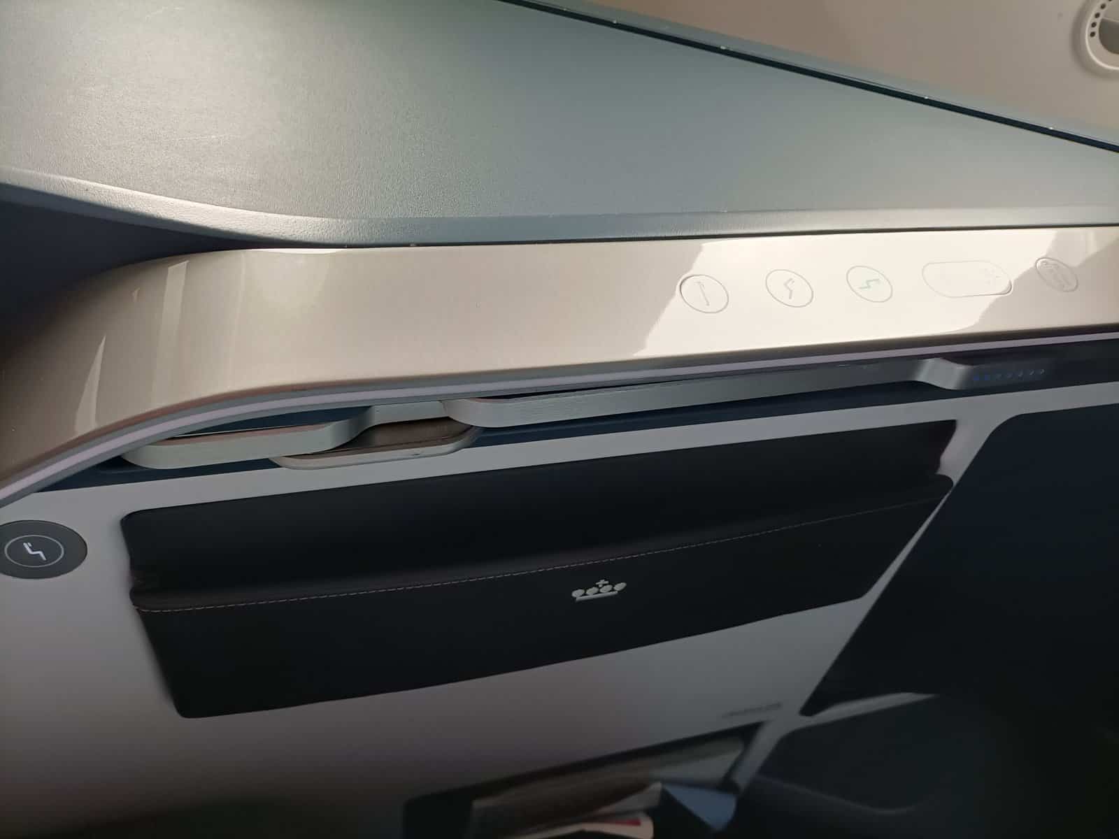 Eveneens is de tafel onder de armleuning gemonteerd. Ik heb begrepen dat de tafel van KLM’s Boeing 787-9 niet heel solide is. Deze tafel is echter voldoende stevig.