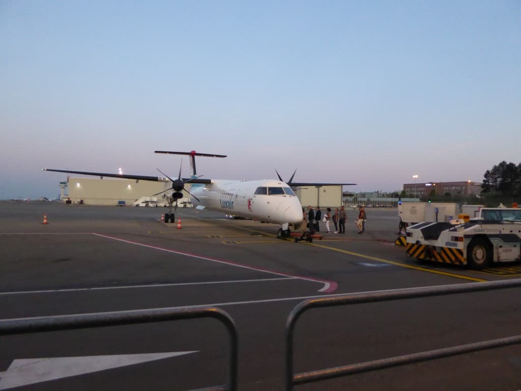Vanaf Luxemburg vertrekken veel regionale vluchten en er is bij deze gate dan ook geen jetbridge aanwezig. Je loopt zo vanuit de gate het toestel in. Buiten staat een Bombardier Q-400 van Luxair.