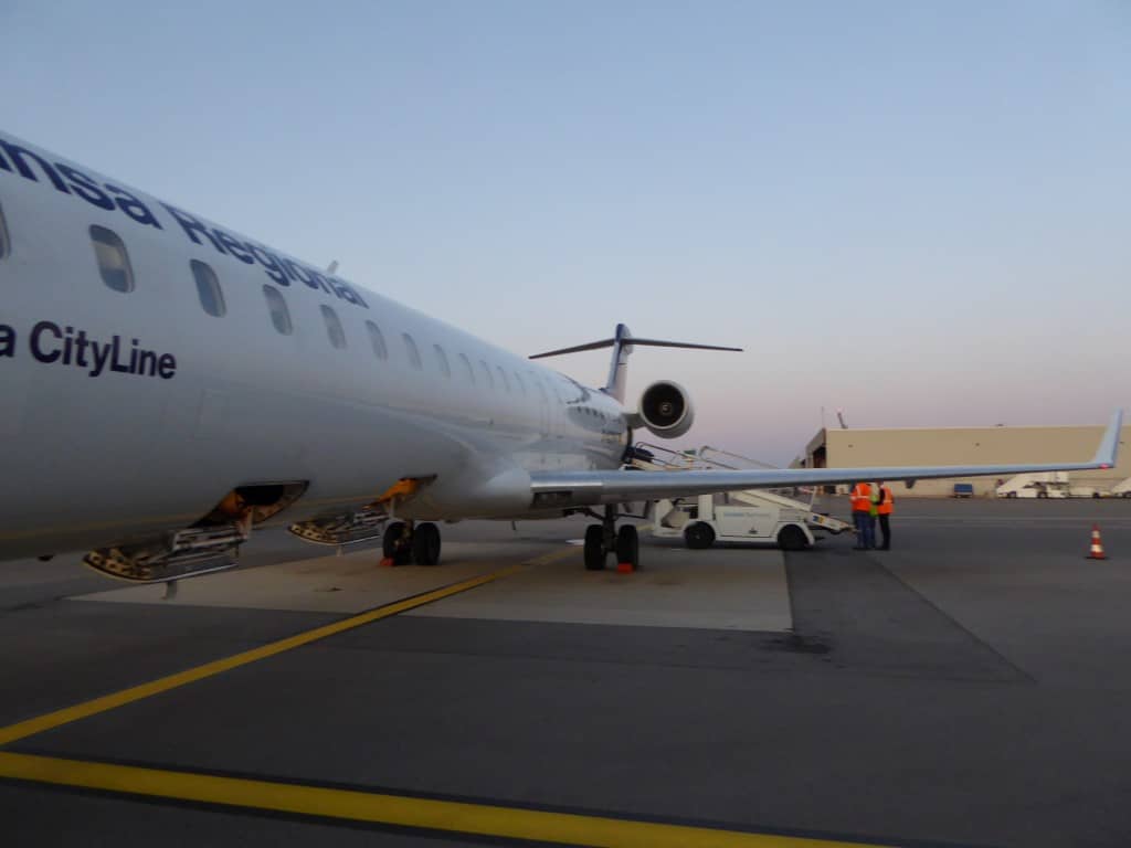 De Bombardier CRJ-900 van Lufthansa staat al gereed, maar we moeten nog even wachten voordat we daadwerkelijk aan boord mogen.