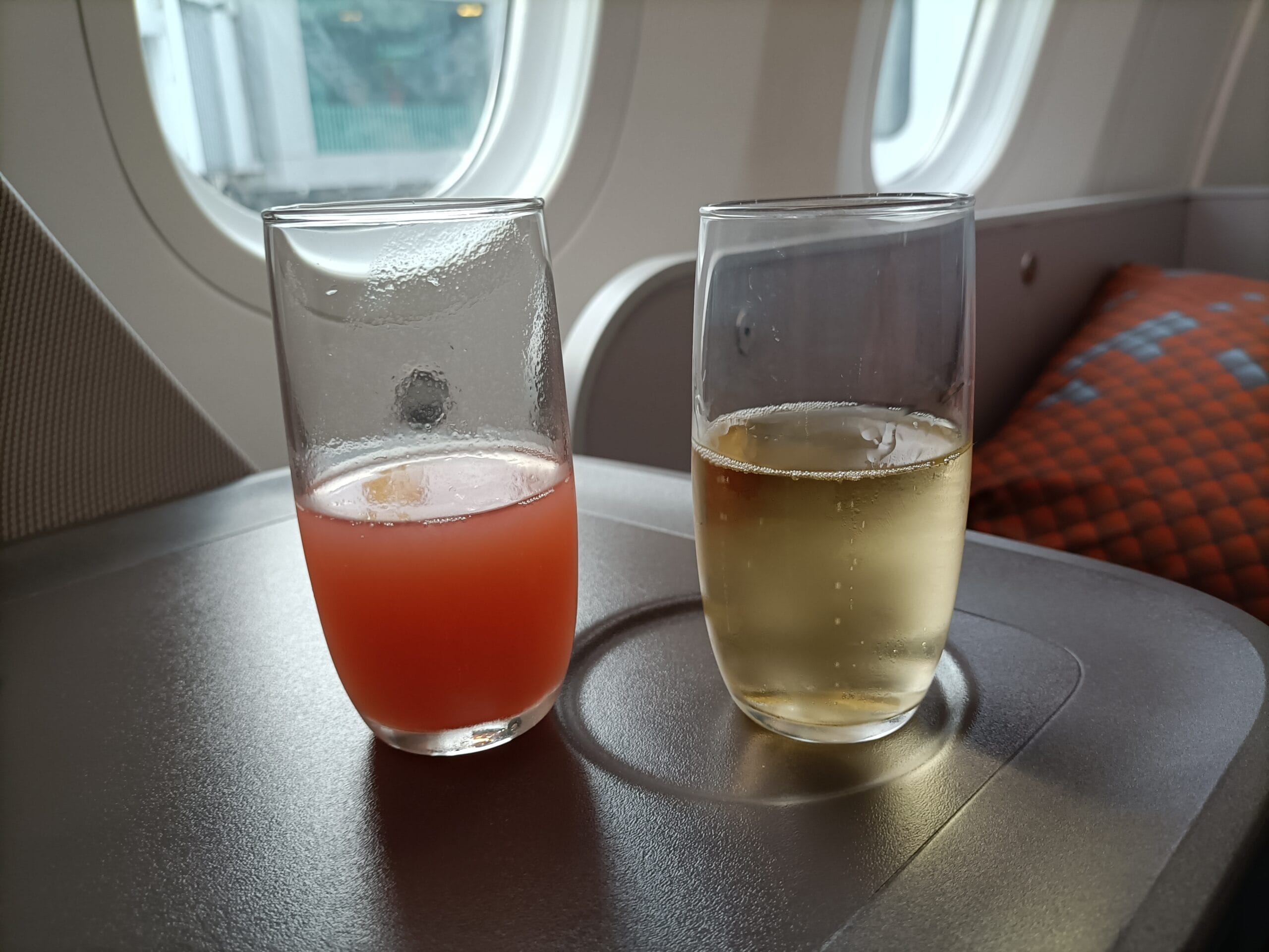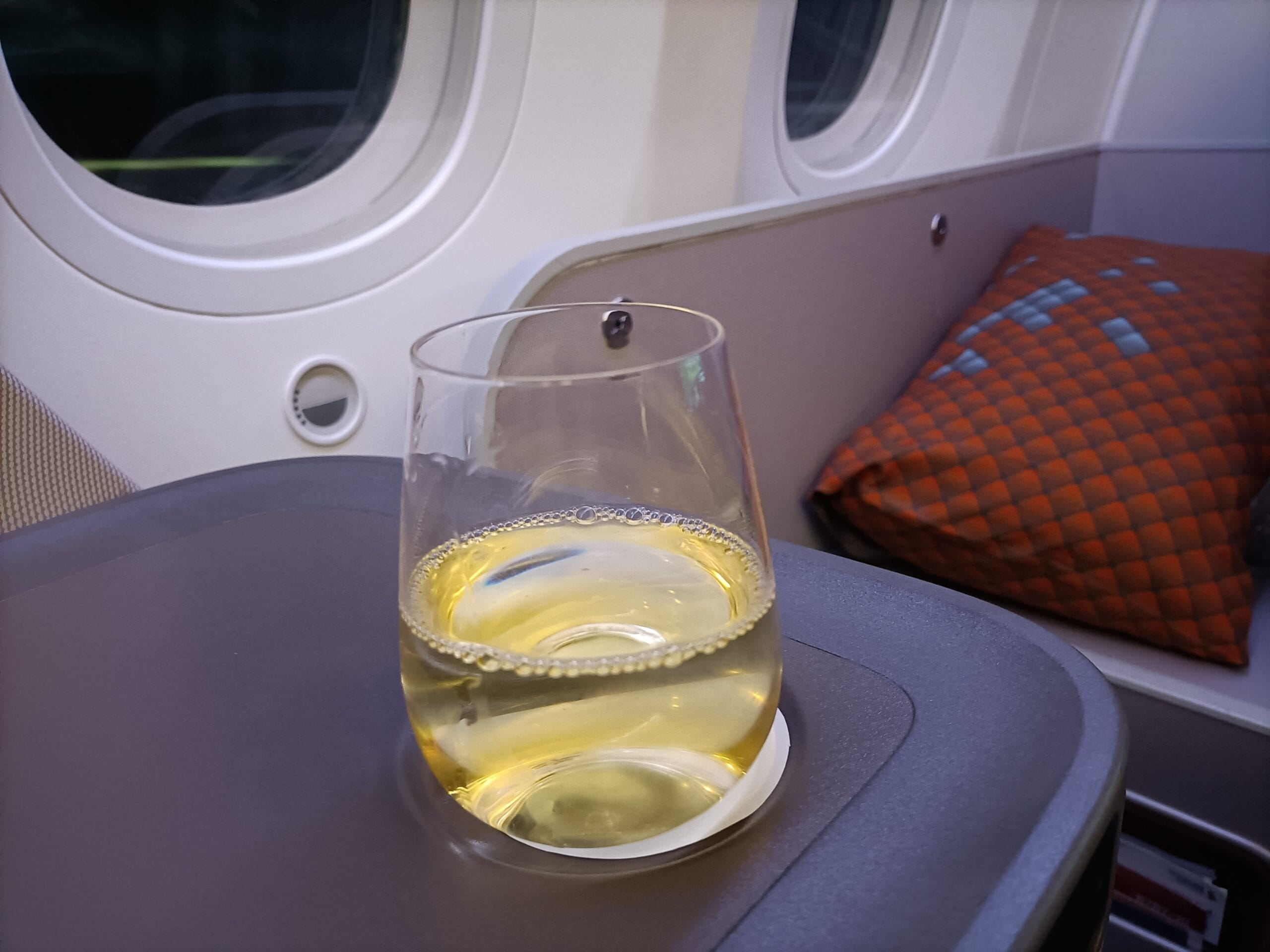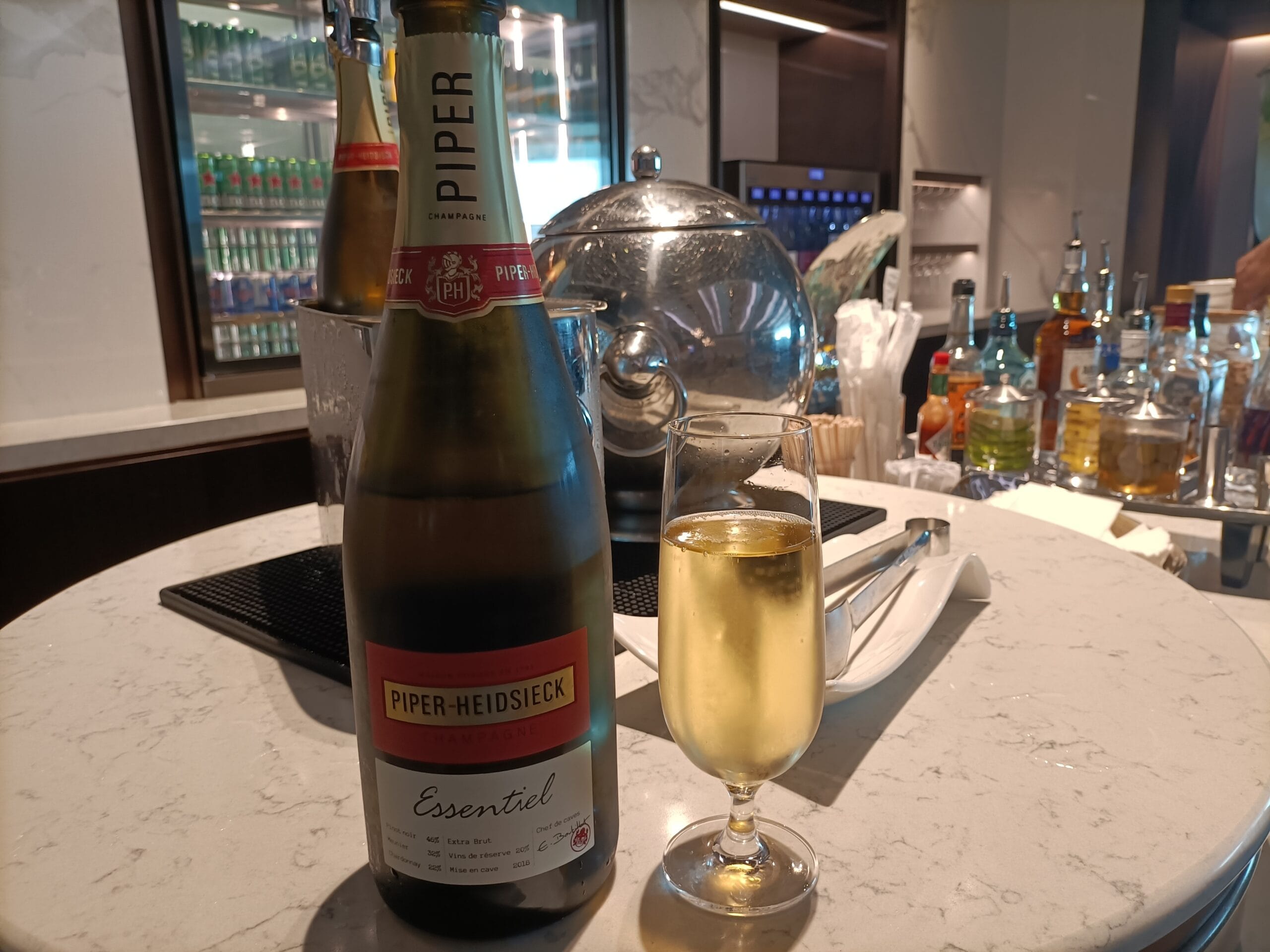 Vrij snel na het opstijgen volgt een drankje: ik kies voor een glas champagne. Tijdens deze vlucht is dat Piper Heidsieck Essentiel Brut, een prima champagne voor deze vlucht! Even later volgt de maaltijd, welke inclusief voor- en nagerecht geserveerd wordt. De maaltijd smaakt uitstekend. Na de maaltijd krijg ik nog diverse keren een refill van mijn champagne aangeboden. Uitstekende service vandaag!
