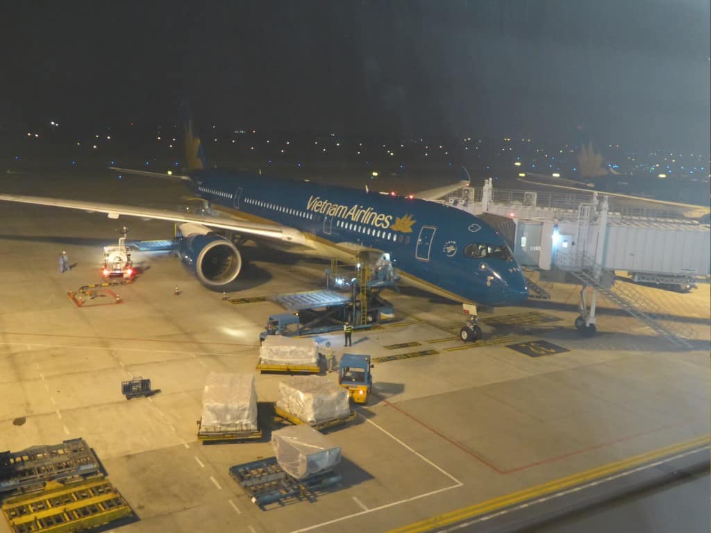Bij de gate staat de Airbus A350-900 van Vietnam Airlines al klaar. De Airbus A350 is sowieso een prachtig toestel, maar het Vietnam Airlines kleurenschema is prachtig!