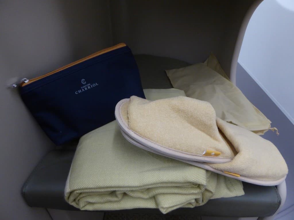 Voor deze vlucht van 3 uur en 45 minuten worden slippers uitgedeeld en een amenity kit. Geweldig voor zo’n korte vlucht! Ook is een deken aanwezig.