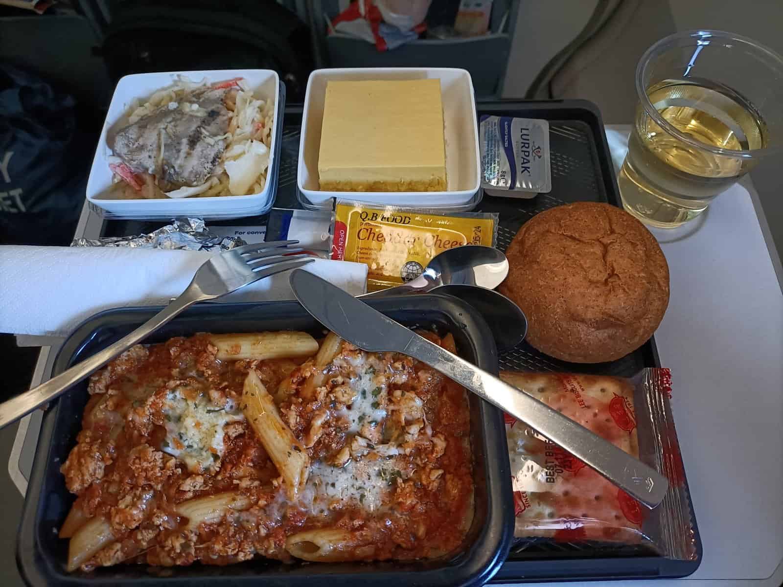 Mede dankzij goed werkende Wifi gaat de rest van de vlucht behoorlijk snel voorbij. Ruim twee uur voor de landing begint de crew aan de volgende maaltijdronde. Ik kies voor de pasta en deze smaakt goed. Beter dan het er uit ziet in ieder geval.