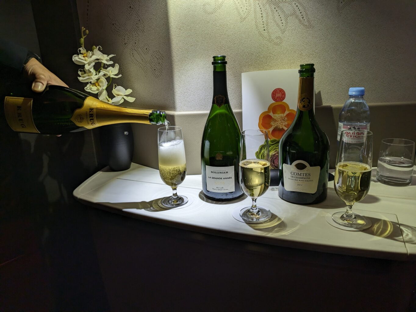 Dit zijn toch wel drie grootsheden op een rij: Krug Grande Cuvée, Bollinger La Grande Annee en Taittinger Comtes 2012. En alles met elkaar staat er toch voor zo’n € 700,00. Na het afruimen van de flessen eindigt ook de service vanwege de verwachte turbulentie.