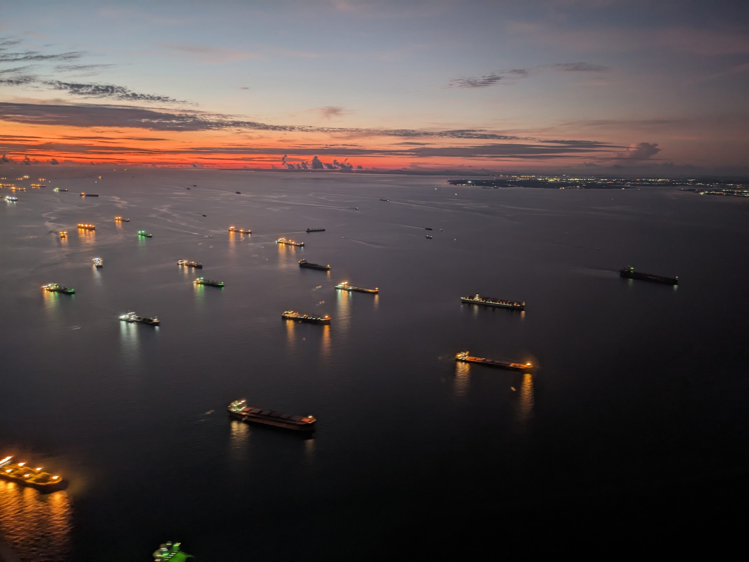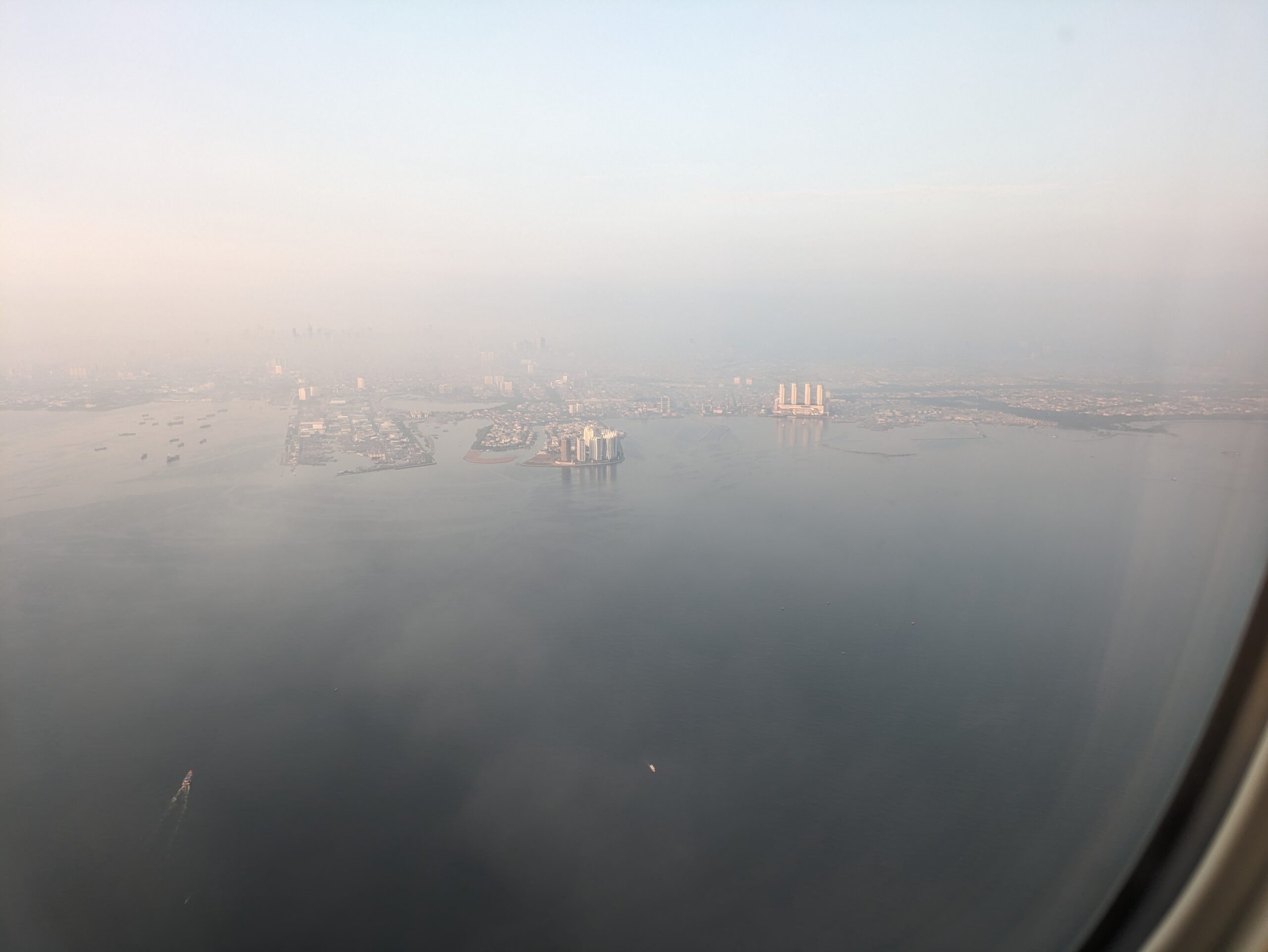De crew vraagt regelmatig of ik nog een glas Krug wil, maar dat lijkt me niet heel verstandig op deze vroege ochtend. En al snel komt de skyline van Jakarta in zicht.