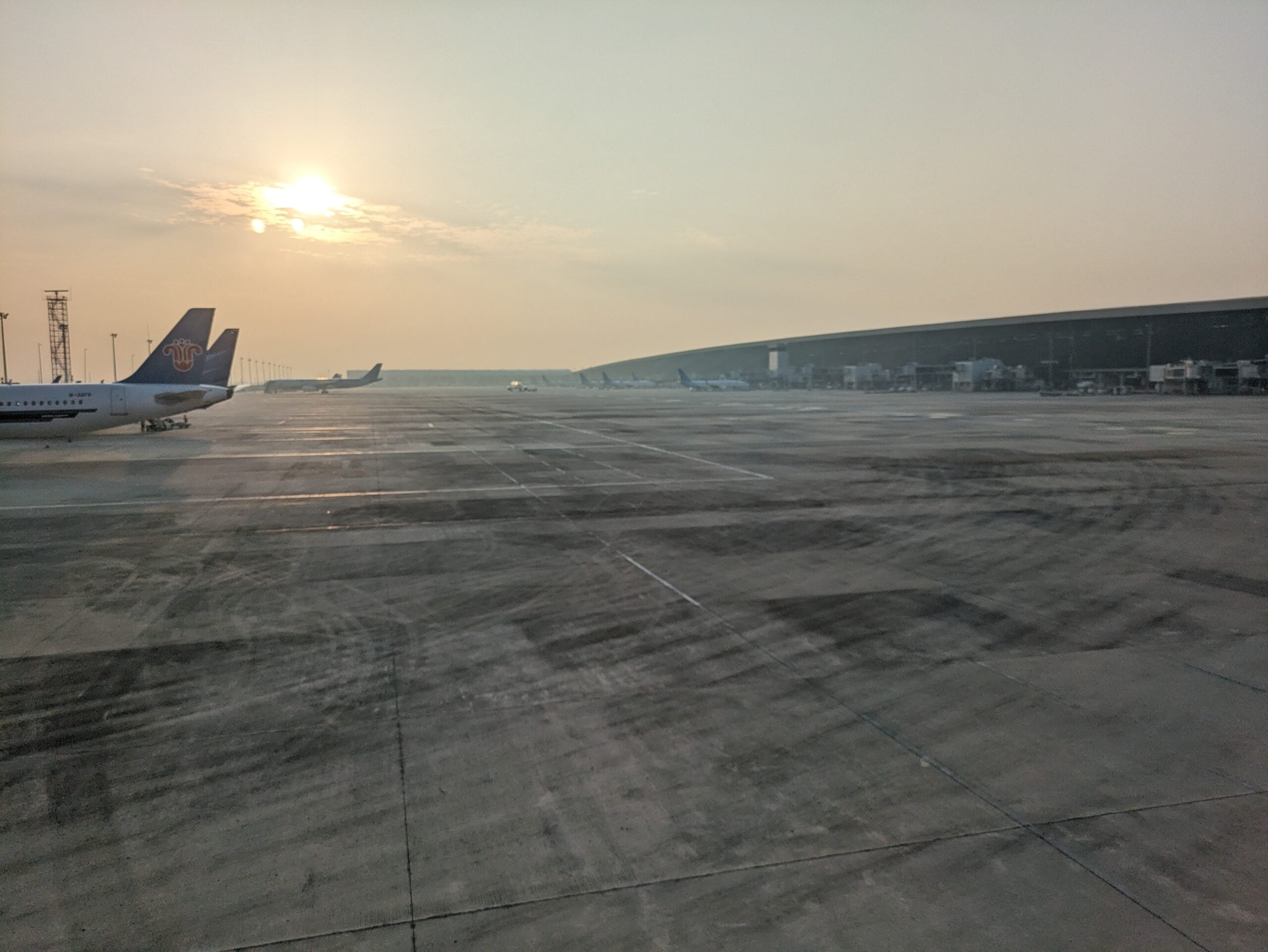 De zonsopkomst is prachtig vandaag. Het uitzicht bij de take-off is dan ook genieten. Het weer is goed vandaag en daarom valt er weinig turbulentie te verwachten.
