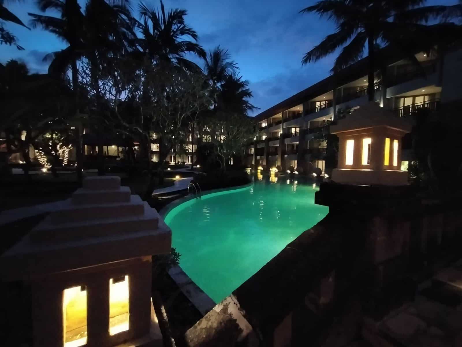 Ook ’s avonds zien het zwembad en de tuinen er prachtig uit. Het hotel was vrijwel volledig volgeboekt tijdens ons verblijf, maar het was zelden druk rond het zwembad.