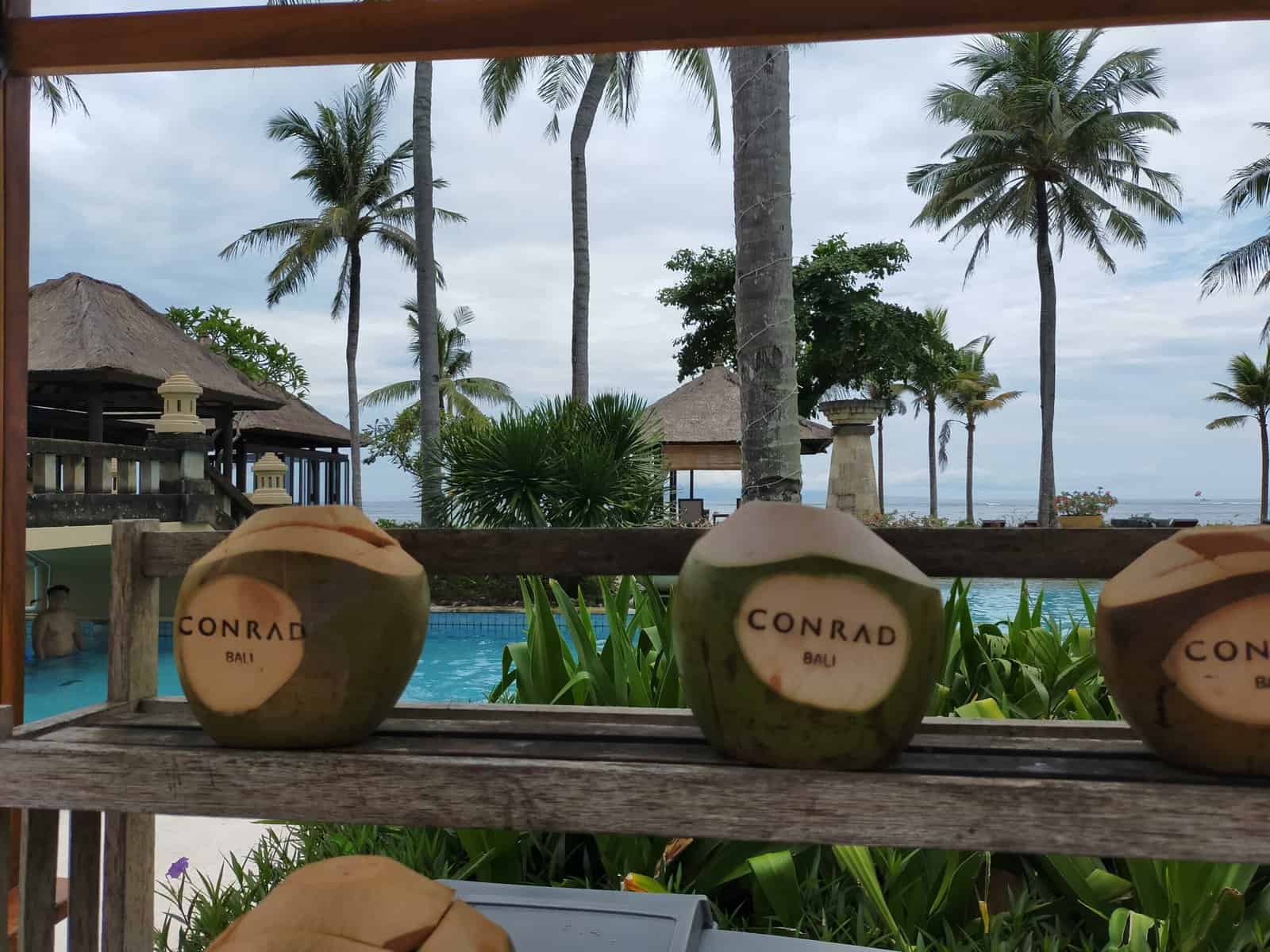 Je kunt ook een drankje nuttigen aan de bar bij het zwembad. De kokosnoten met het Conrad Bali logo zijn leuk om te zien.