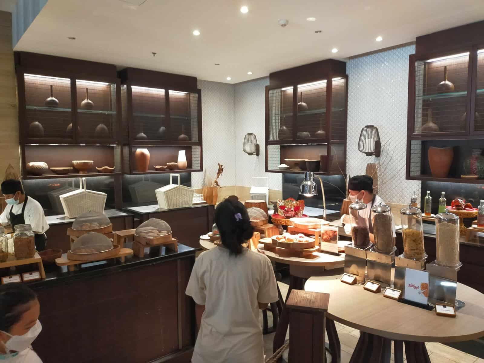 Het ontbijt bij Conrad Bali is ontzettend uitgebreid. Het is een ontbijtbuffet maar vanwege COVID scheppen medewerkers de gerechten voor je op. Daarnaast zijn er diverse mogelijkheden om gerechten vers te laten bereiden. Je kunt het ontbijt in het restaurant nuttigen of buiten. In het restaurant kan het behoorlijk druk zijn, vooral als het hotel vrijwel volgeboekt is.