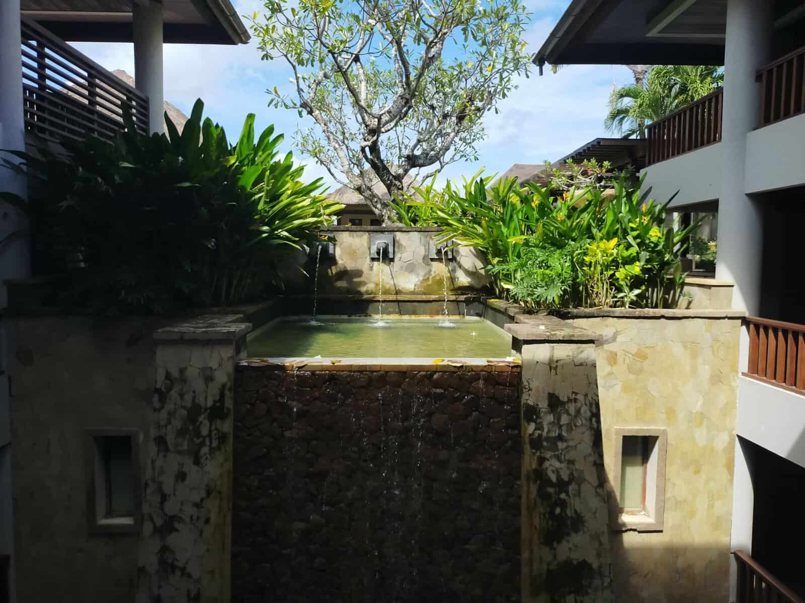 Na het inchecken lopen we via de mooie binnenplaats naar onze kamer. Conrad Bali heeft verschillende gebouwen en onze kamer bevindt zich in hetzelfde gebouwd als de receptie.