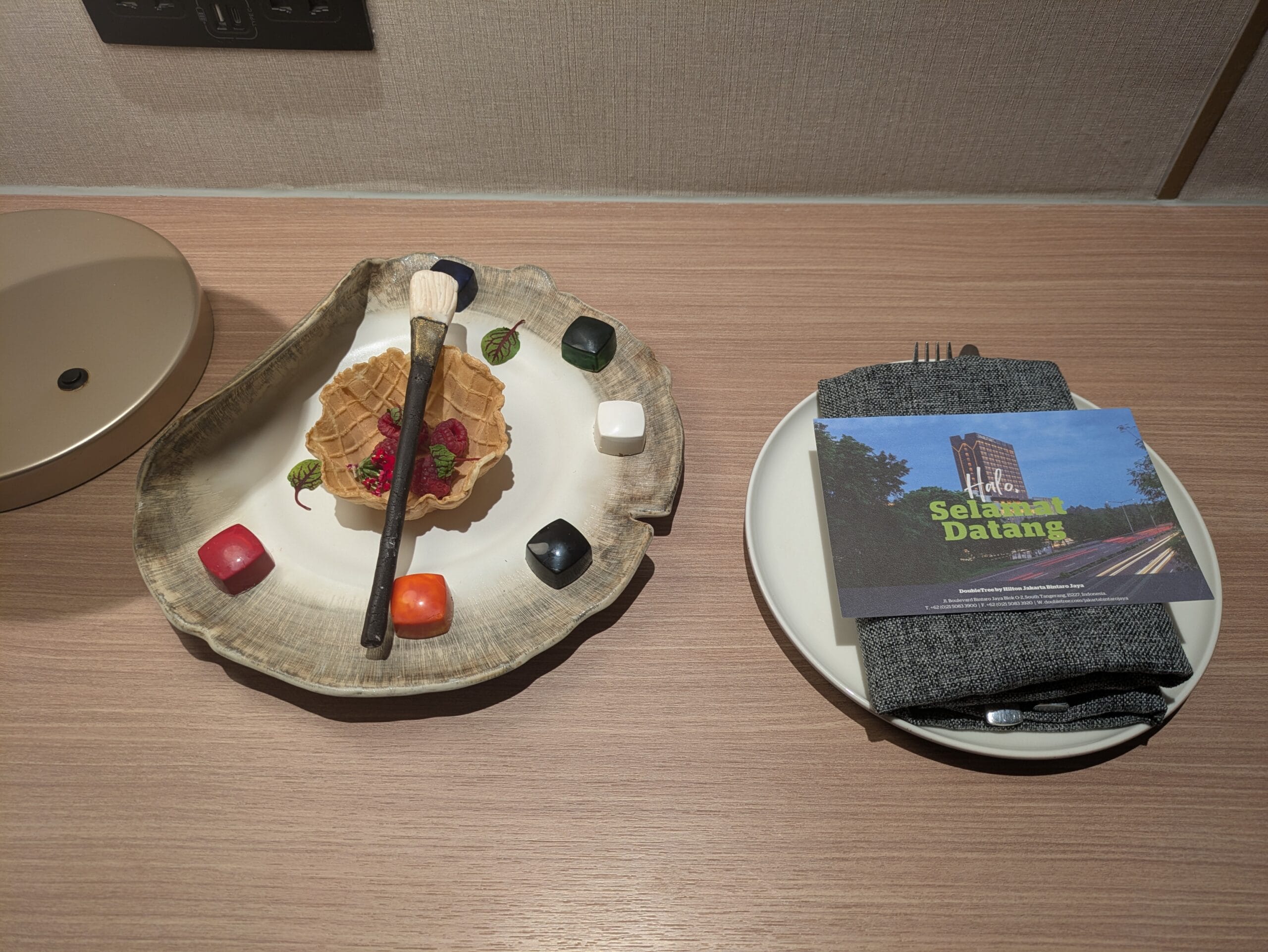 Op het bureau staat een welkomstgeschenk klaar, iets waar Aziatische hotels bovengemiddeld goed in zijn.