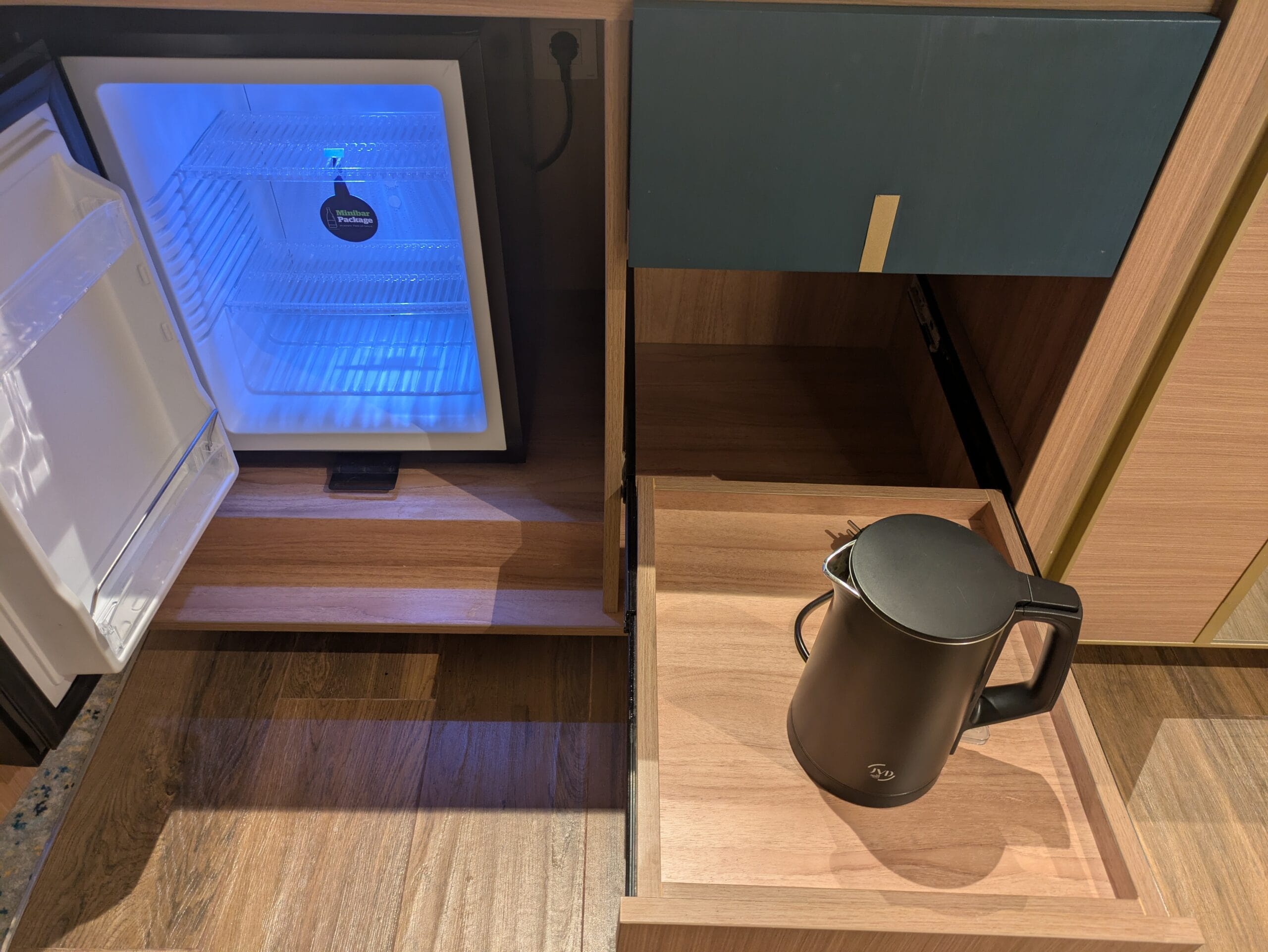 De minibar is leeg, wat bij DoubleTree hotels de norm is. Een koffiemachine ontbreekt helaas: voor koffie (en thee) ben je aangewezen op de waterkoker en oploskoffie. Het is niet ongebruikelijk voor hotels van dit prijsniveau, maar voor een langer verblijf zie ik graag een volwaardige machine. Bij mijn eerdere verblijf in de suite was wel een volwaardige koffiemachine aanwezig.
