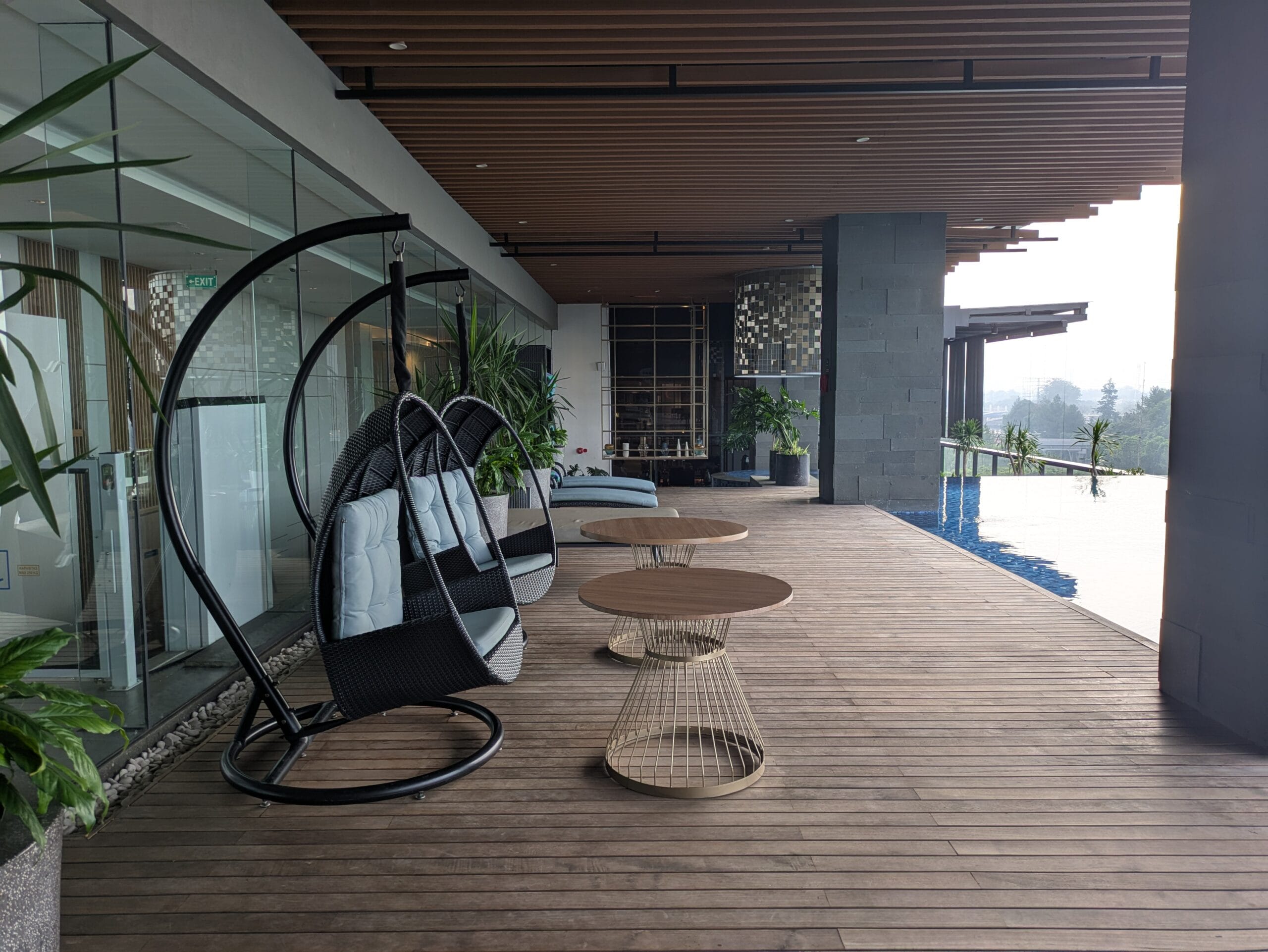 Mijn kritiek bij zakenhotels in Jakarta is dat veel zwembaden een “moetje” zijn en weinig sfeer hebben. Dat is hier anders. Naast het mooie groene uitzicht is het geheel leuk ingericht. Het vele houtwerk op de grond en plafond draagt hier ook in positieve zin aan bij. Ook in de avond ziet het zwembad er prachtig uit.