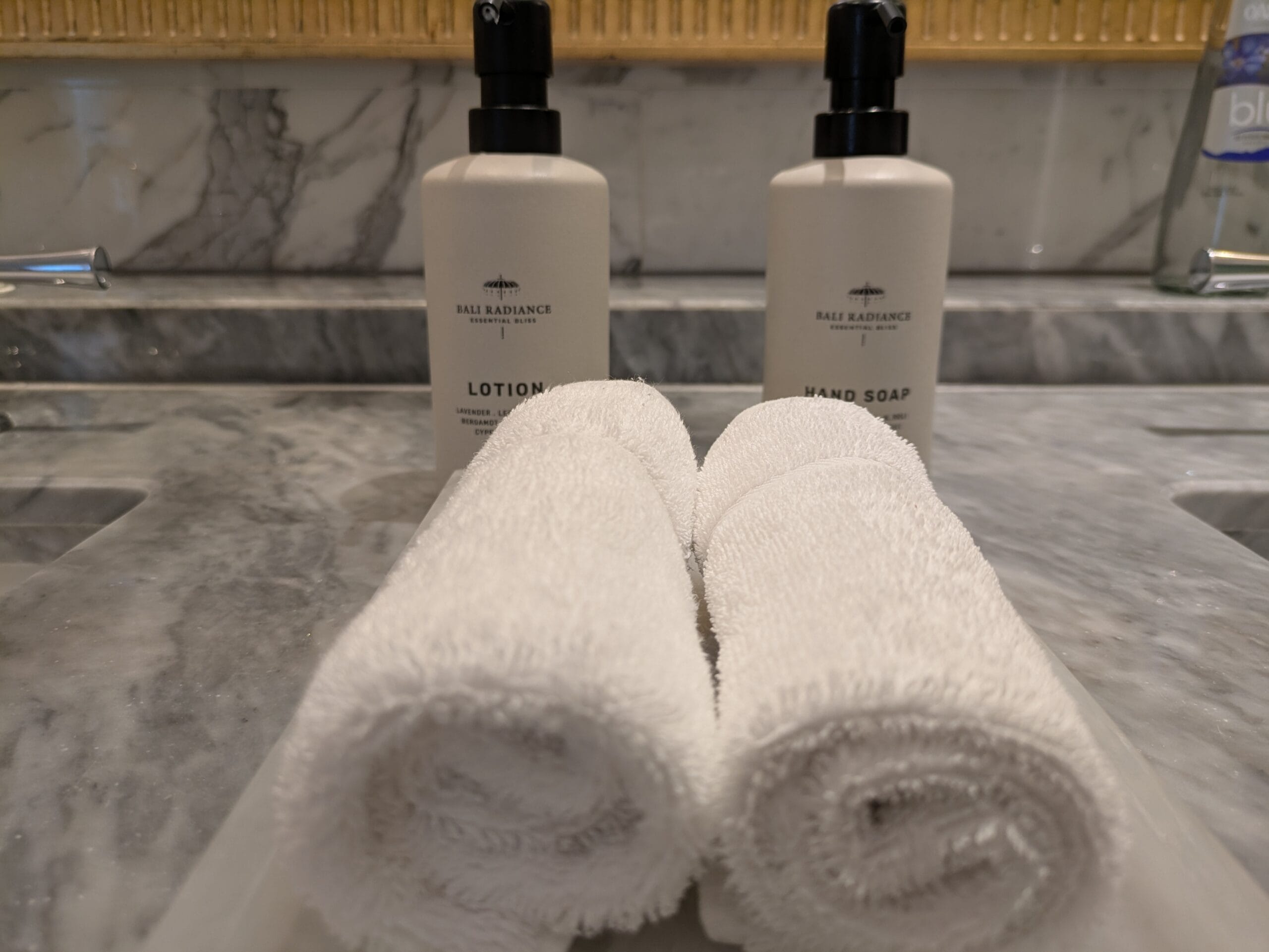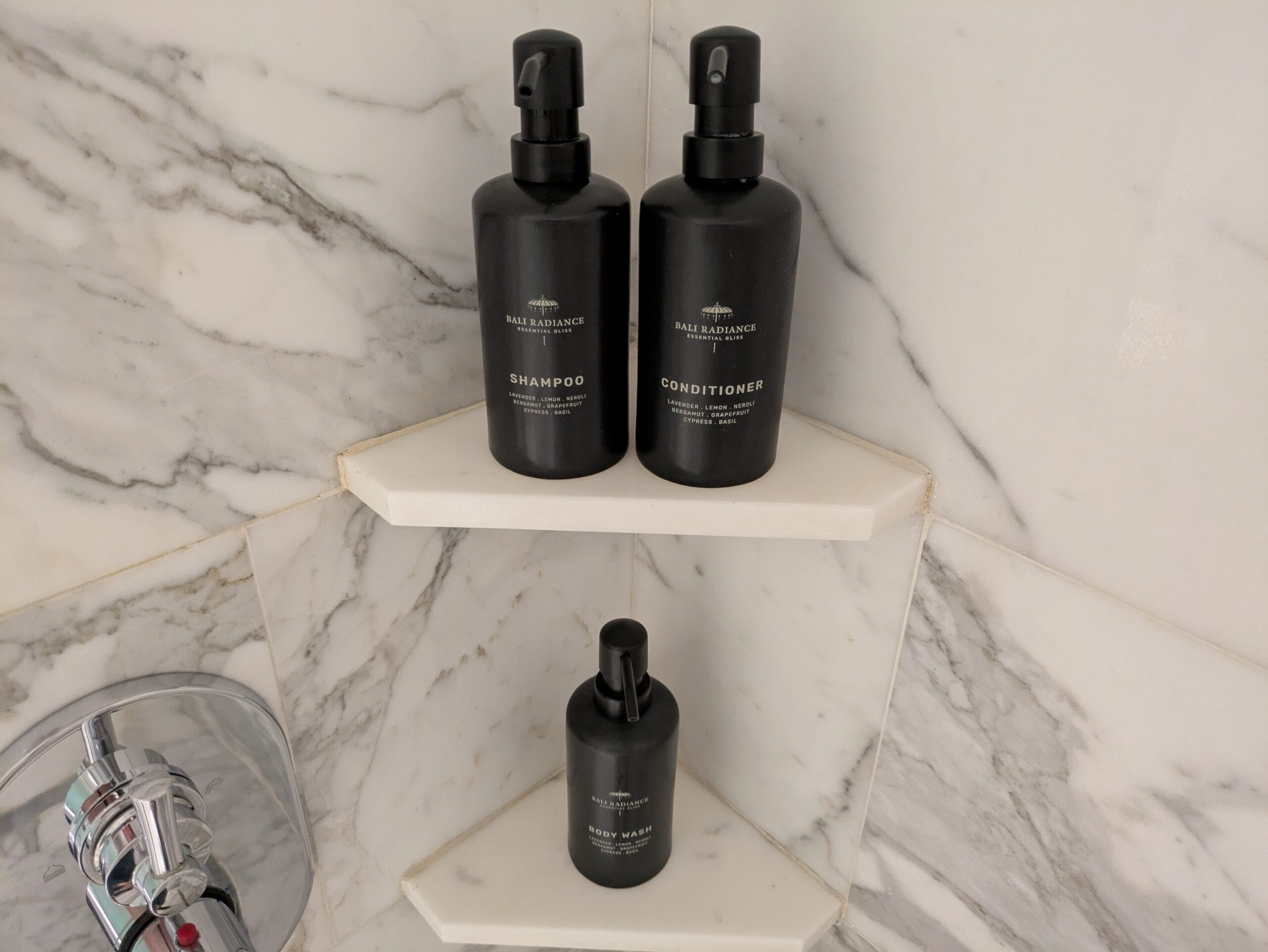 De dubbele wastrafel is voorzien van een ruim assortiment aan badkamerbenodigdheden. De badkamerproducten zijn van Bali Radiance, een 100% natuurlijk en biologsch merk. Ik vind het positief dat het hotel kiest voor een lokaal premium merk, vooral omdat Bali bekend staat om goede zeep en olie.