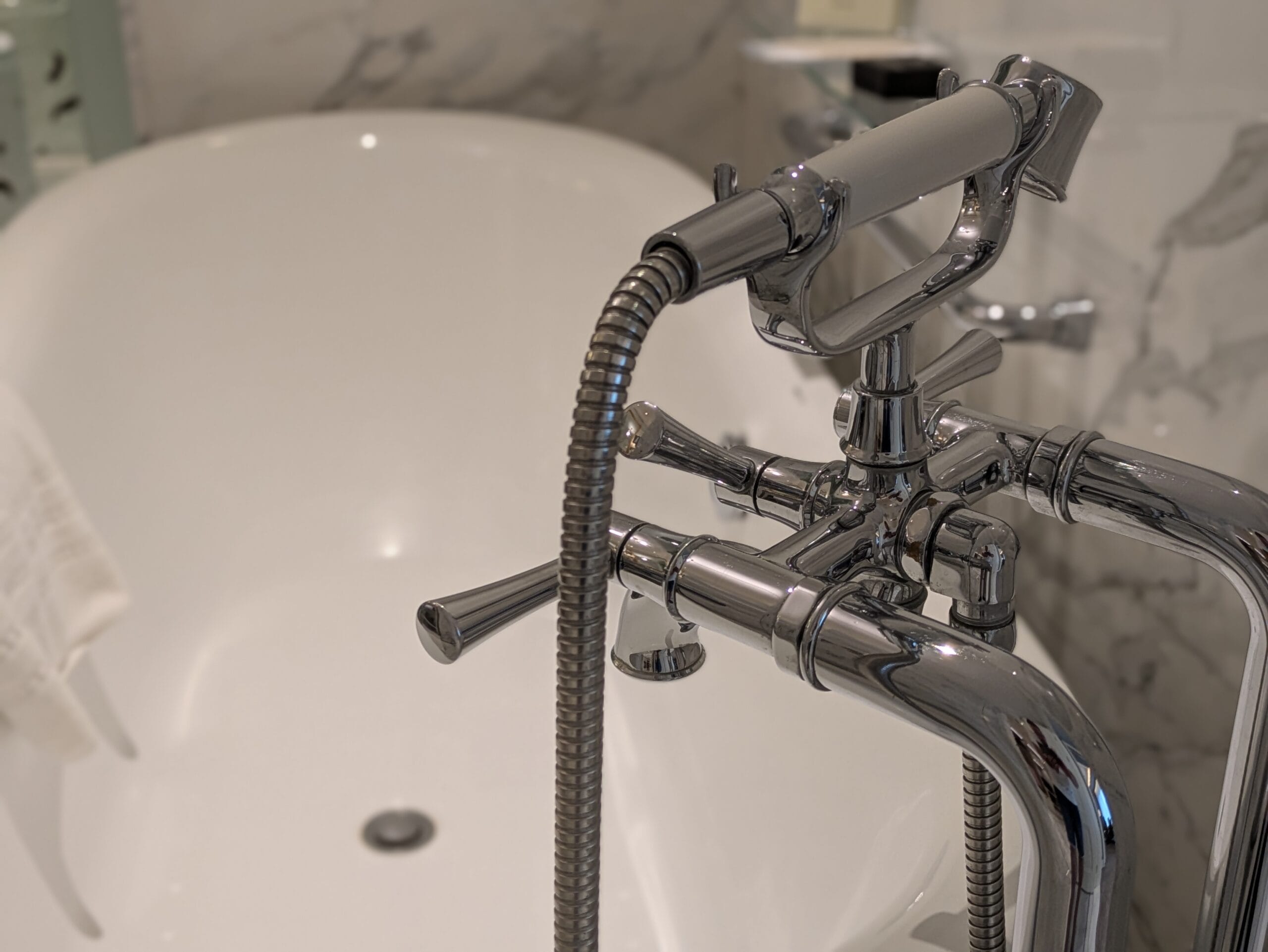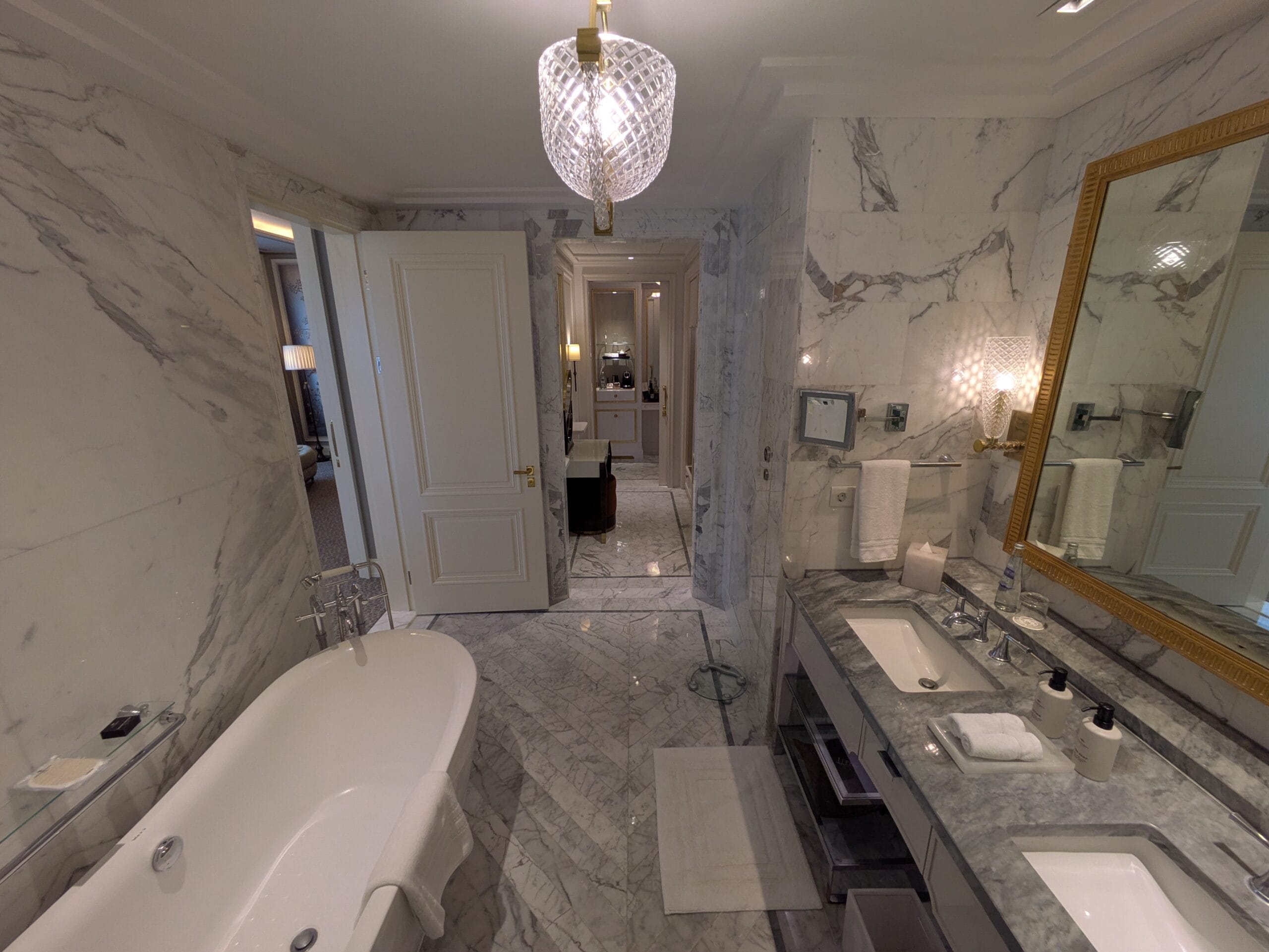 De inloopkast is gecombineerd met de badkamer. De vloer van de inloopkast is van wit en grijs italiaans marmer, waar de badkamer in z’n geheel uit bestaat. Het interieur van de badkamer past verder goed bij de rest van de kamer: klassieke kranen, een diep – klassiek – ligbad en kroonluchters aan het plafond.