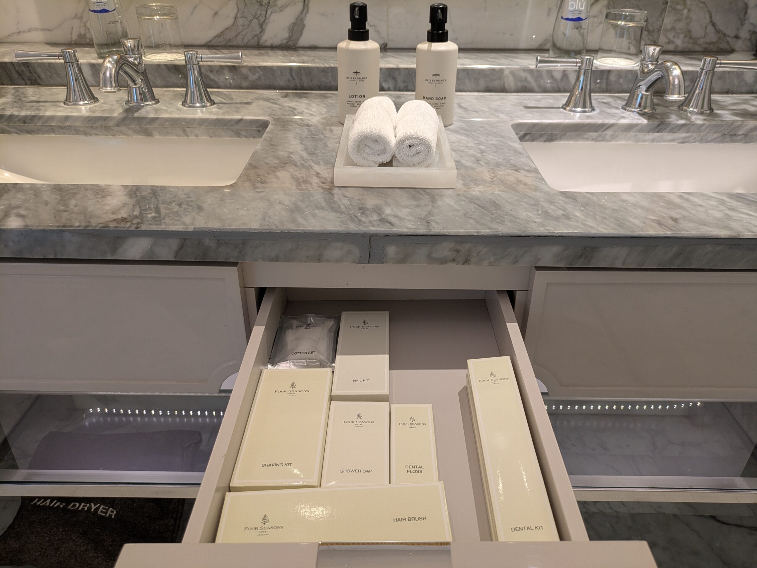 Bij binnenkomst valt gelijk op dat de lobby niet direct doet denken aan een Four Seasons hotel, die over het algemeen wat strakker en minimalistischer zijn. Dit heeft waarschijnlijk te maken met het feit dat dit hotel oorspronkelijk zou openen als een St. Regis. Je ziet de dagelijkse chamapgne sabrage van St. Regis gemakkelijk voor je als je naar de forse trap in de lobby kijkt.