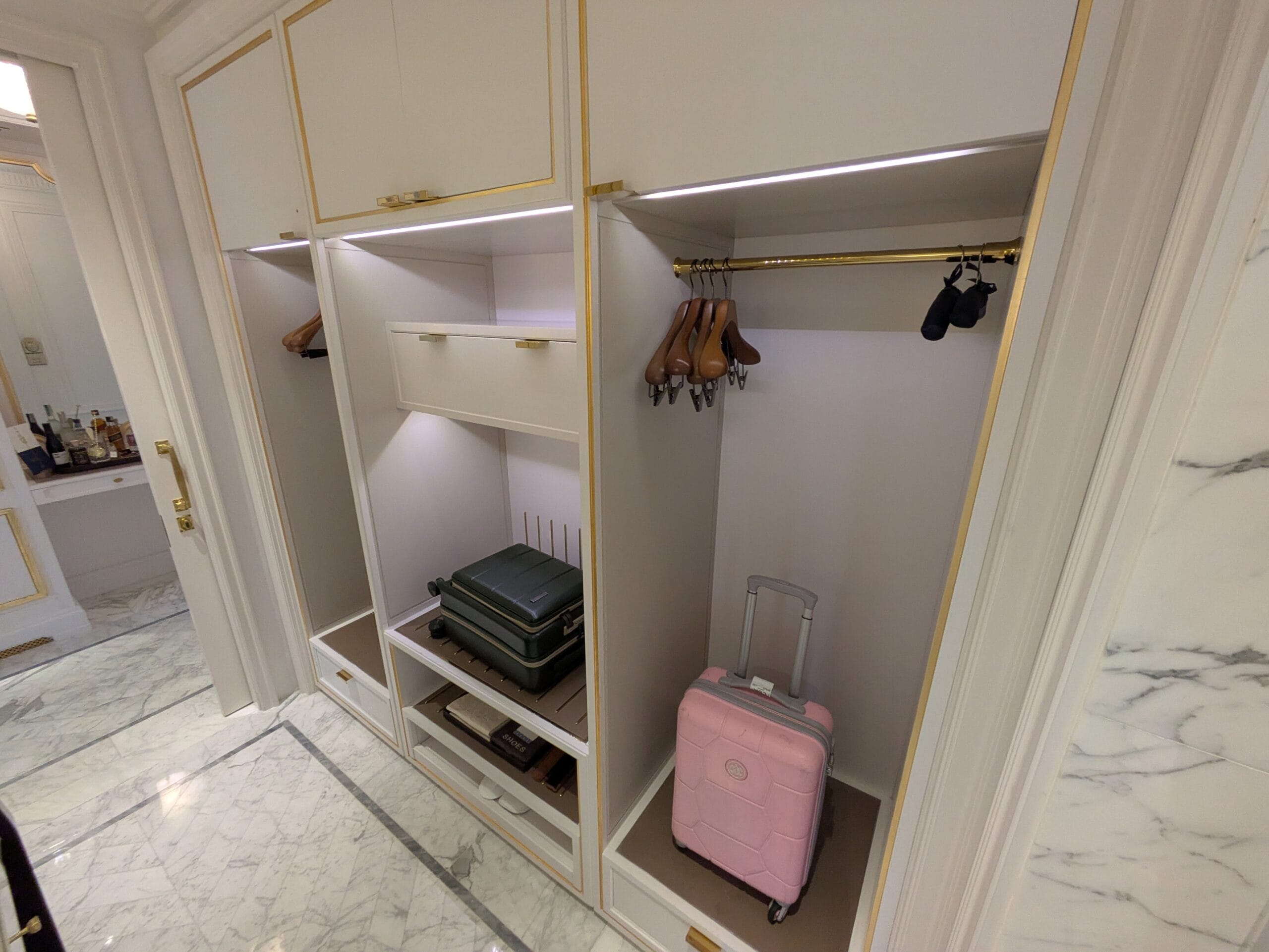 Vanuit de woonkamer van de suite loop je naar de inloopkast. Hier is voldoende ruimte voor koffers en kleding en een kaptafel. Alle zaken die je verwacht zijn aanwezig: slippers, een linnen zak voor de laundry service, een kluis en voldoende opbergruimte.