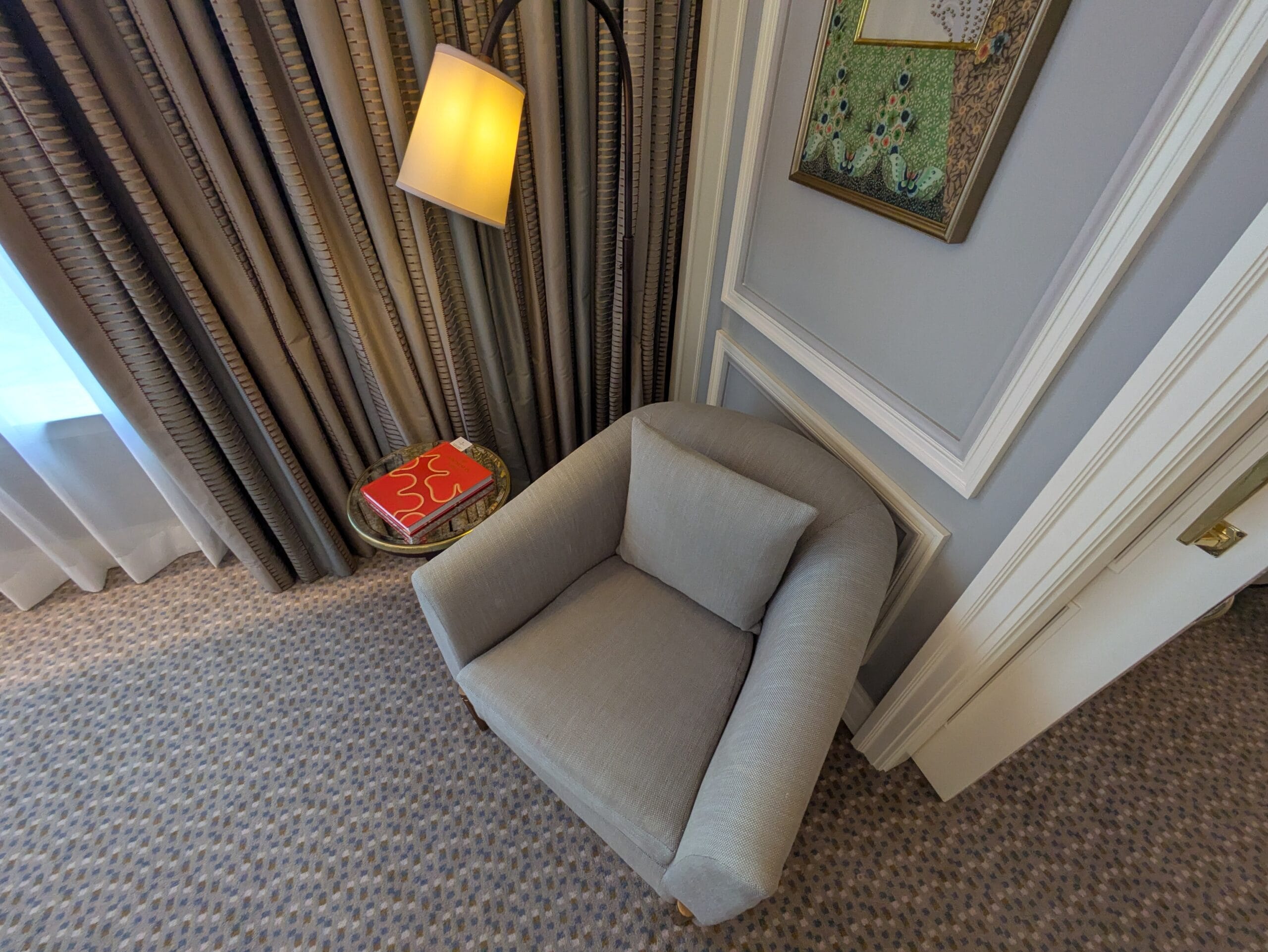 De conciërge verzorgt onze check-in. Hij geeft aan dat we een upgrade hebben ontvangen van een Deluxe Suite naar een Premier Suite. We krijgen een welkomstdrankje en een verfrissingsdoekje. Na een paar formaliteiten is het tijd om naar de kamer te gaan. Zoals gebruikelijk in een luxe hotel neemt de conciërge ons mee naar de kamer.