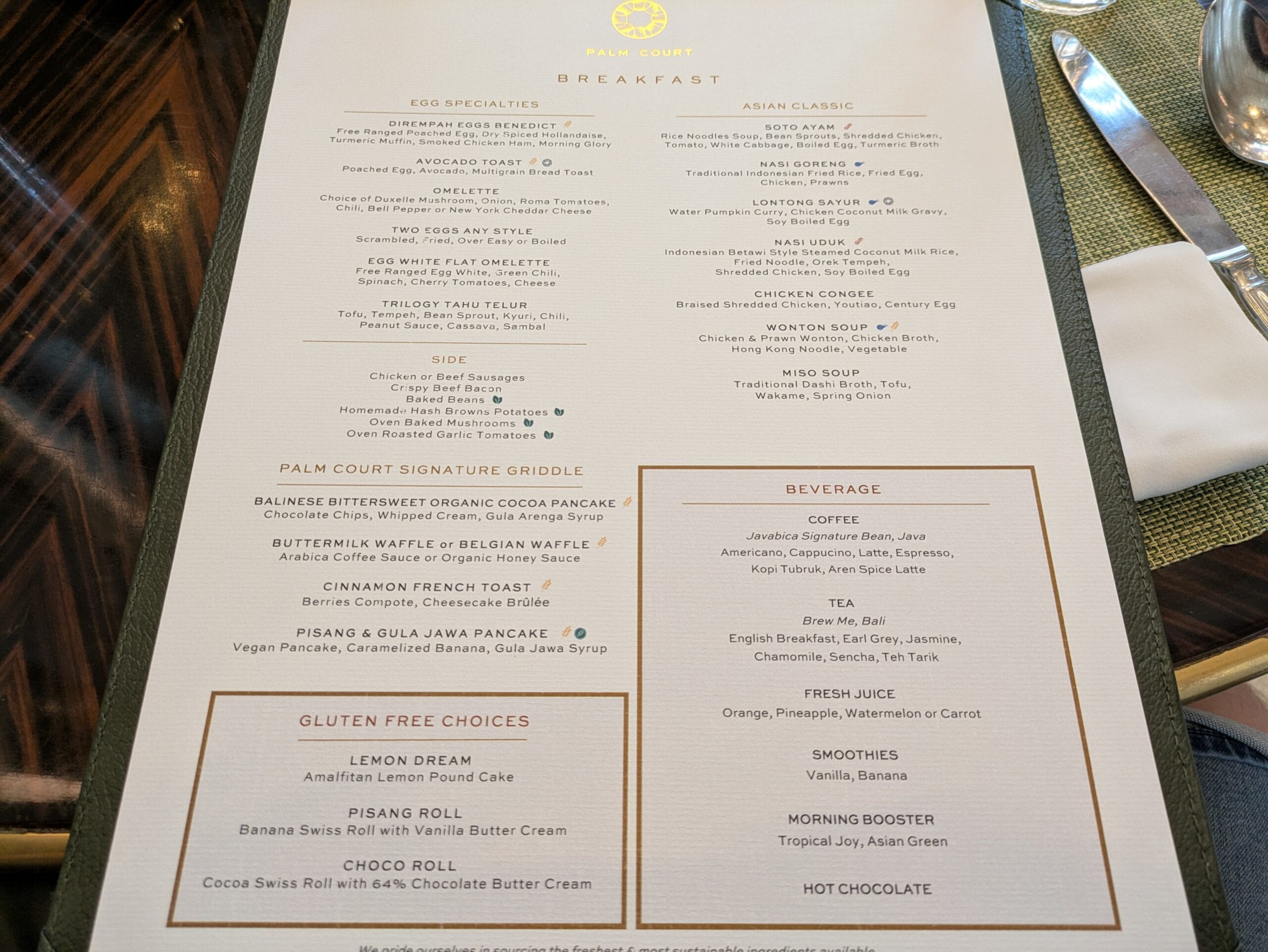 Het ontbijt wordt geserveerd in Palm Court, het restaurant op de begane grond. Met het Four Seasons Preferred Partner tarief zouden we ook op de kamer kunnen ontbijten, maar we geven de voorkeur aan het restaurant.