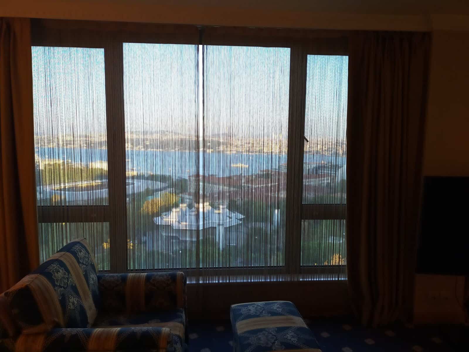 Een fantastische eigenschap van de suite is natuurlijk het uitzicht over de Bosporus. De kamer is overwegend gedateerd qua elektrische apparatuur, maar de gordijnen kunnen automatisch geopend worden.
