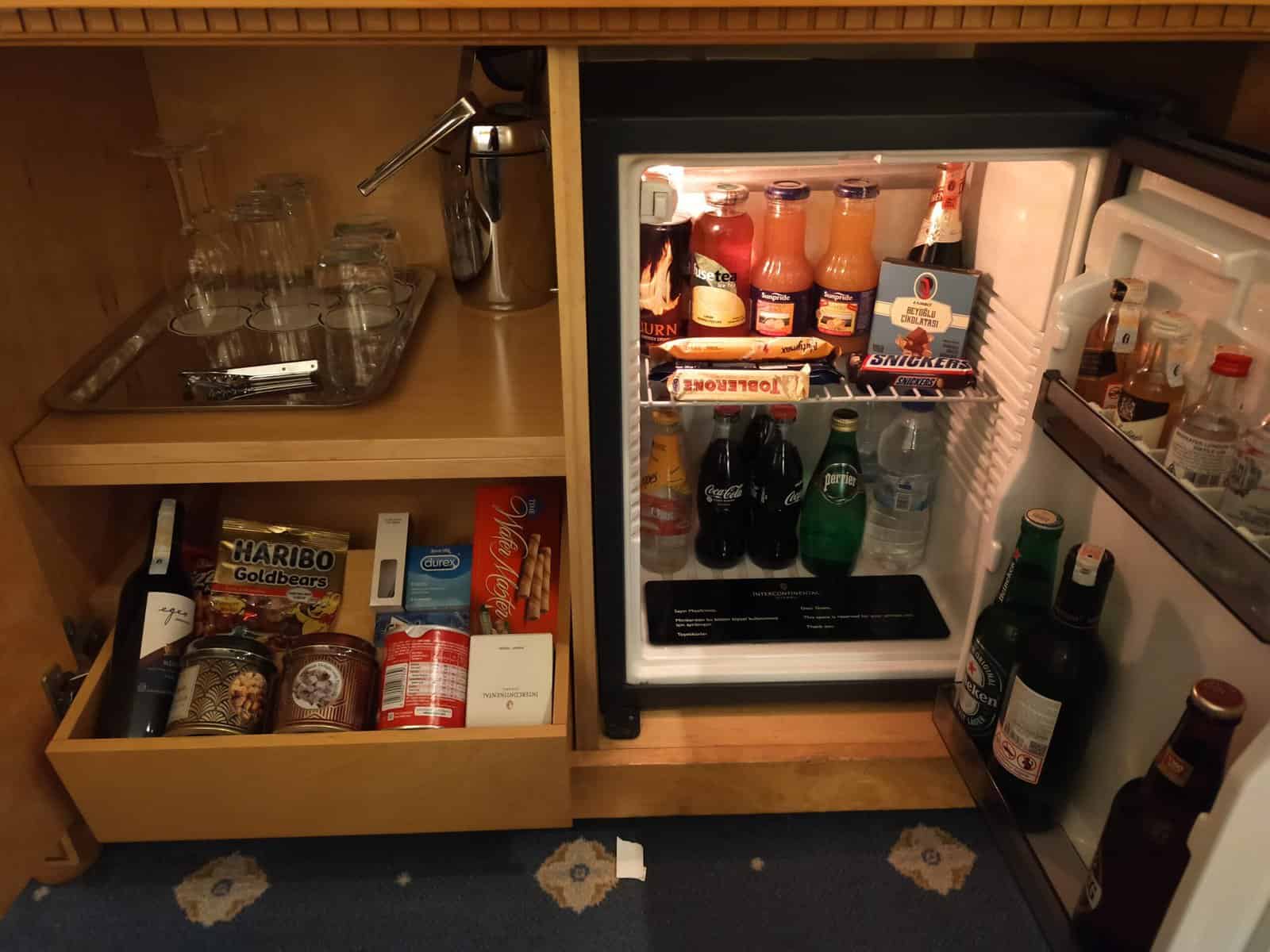 In het slaapgedeelte is ook een kast geplaatst met koffiemachine van Nespresso en daaronder de minibar. Deze minibar is volledig gevuld: dat zie je tegenwoordig wel eens anders in verband met COVID.