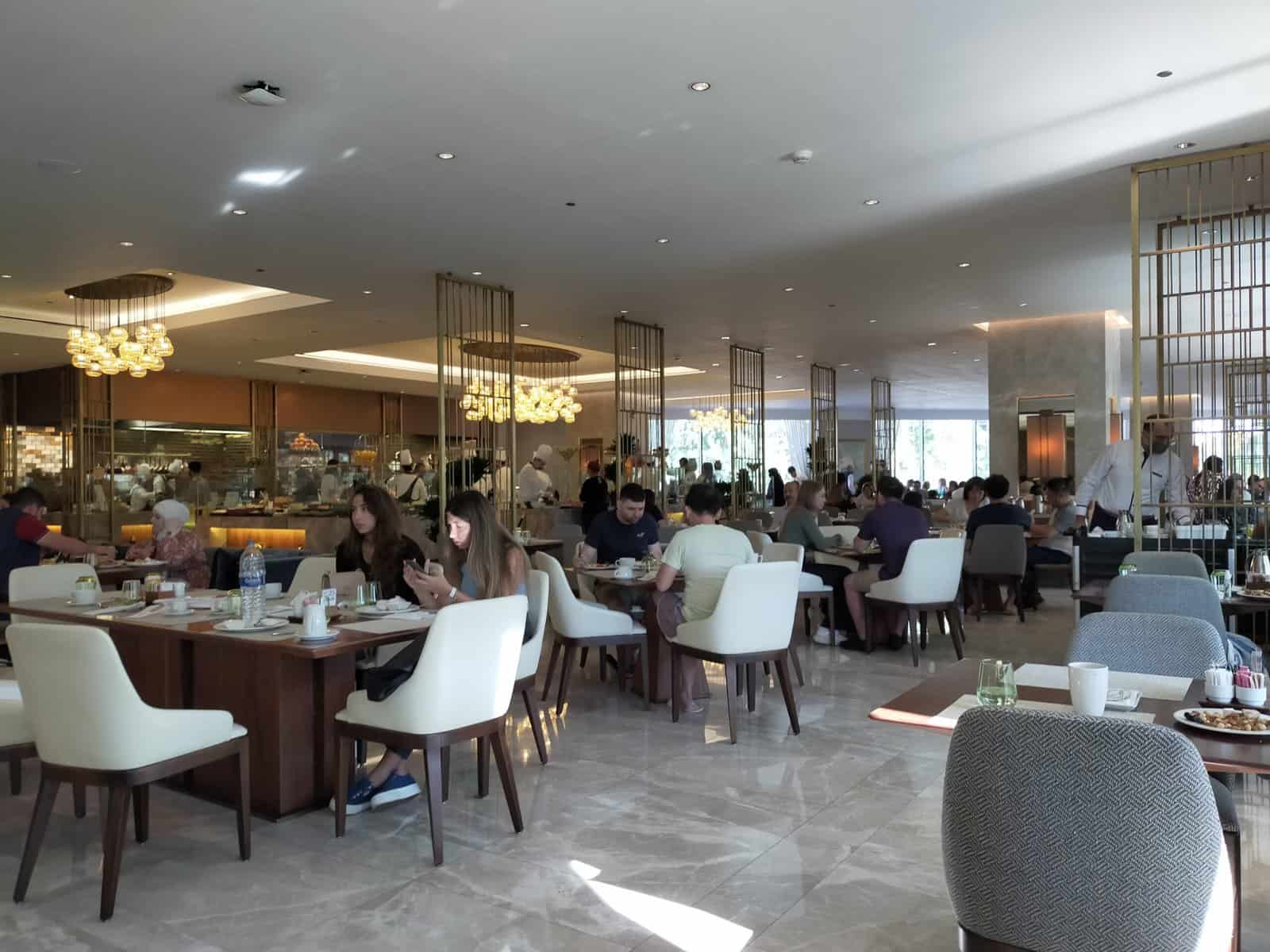 Het ontbijt is in buffet stijl waarbij een personeelslid het gekozen eten voor je opschept. In het restaurant kan het wel enorm druk tijdens het ontbijt. Koffie, thee en sappen worden regelmatig langsgebracht. Je kunt daarnaast een omelet of gebakken ei bestellen. Speciale gerechten zoals Eggs Benedict behoren niet tot de mogelijkheden. Het aanbod van het buffet is echter enorm. Diverse soorten kaas, honing, visgerechten, broodjes, baklava: het is er allemaal.