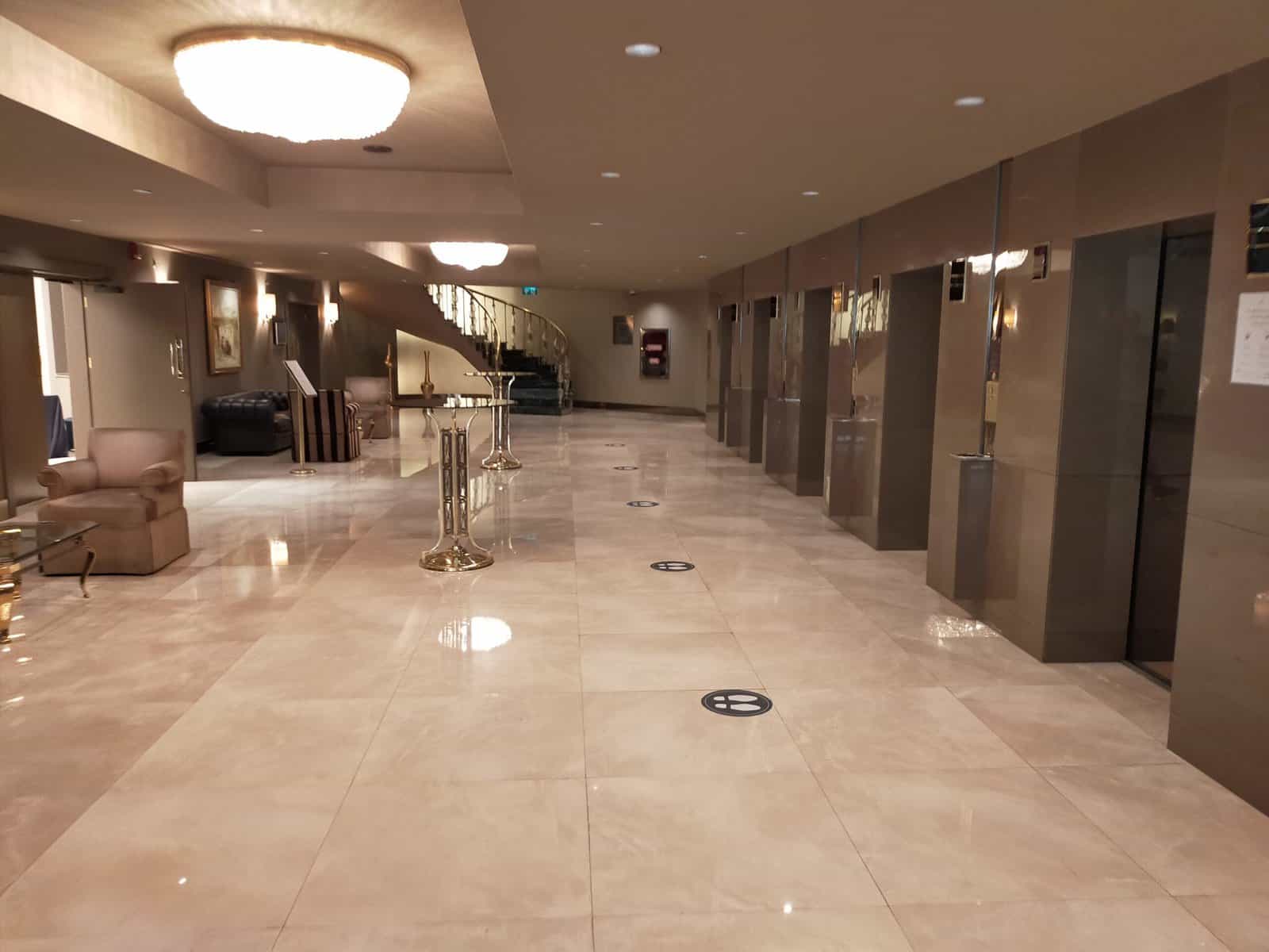 Ondanks de chique indeling is – vooral als je bij de liften staat – goed te zien dat het hier gaat om een groot zakenhotel. Toch hoef je niet al te lang te wachten op de lift. Tijd om naar de elfde verdieping te gaan en onze kamer te bewonderen!