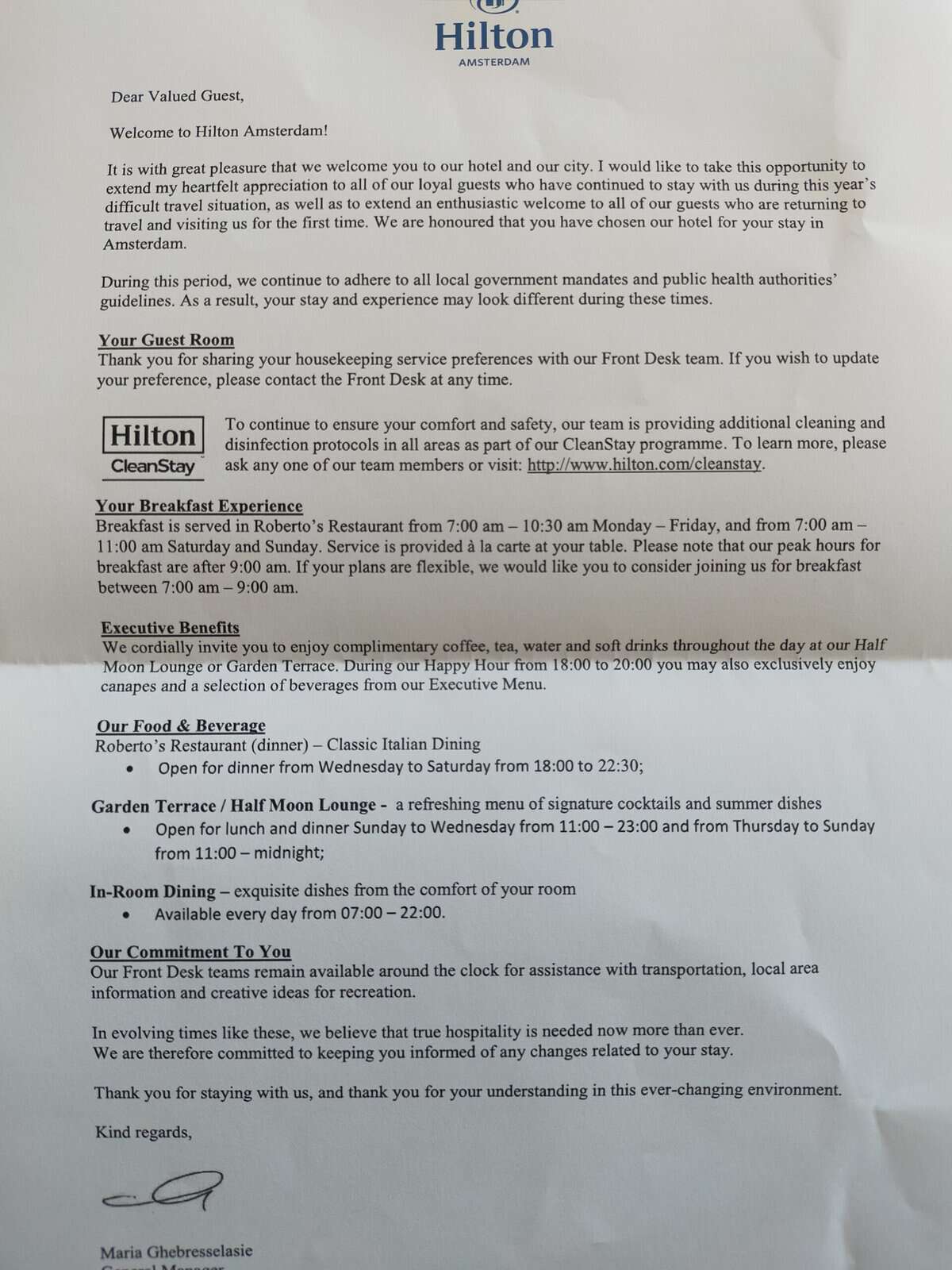 Bij de check in krijgen wij een brief van de General Manager. Hierin wordt onder andere stilgestaan bij de Executive voordelen. De Executive Lounge is momenteel gesloten, maar je kunt tussen 18.00 uur en 20.00 uur terecht bij Garden Terrace voor (alcoholische) drankjes en hapjes. Normaliter kun je de gehele dag koffie, thee en frisdrank pakken in de lounge, waardoor het hotel dit ook aanbiedt in de bar en het terras.