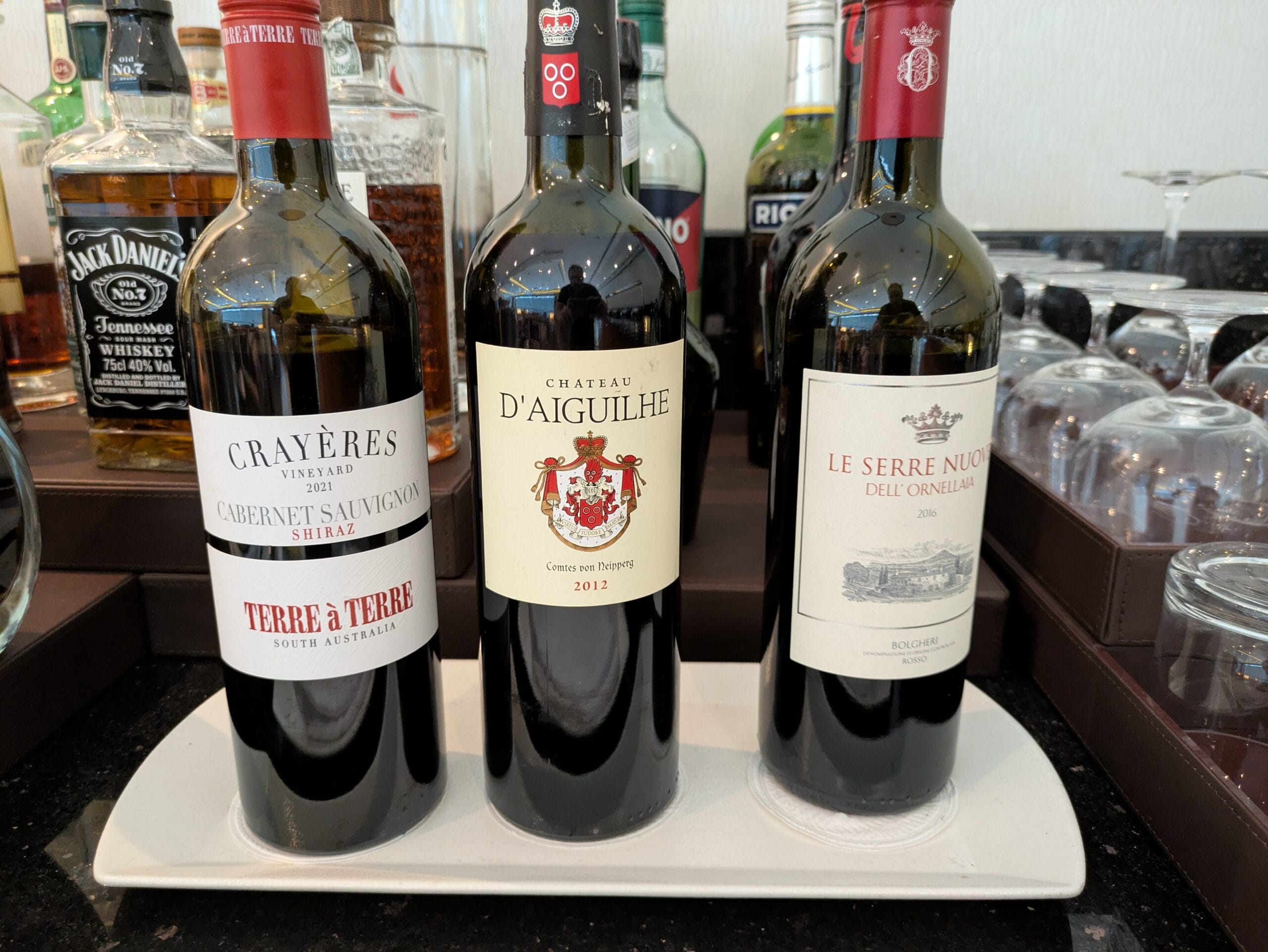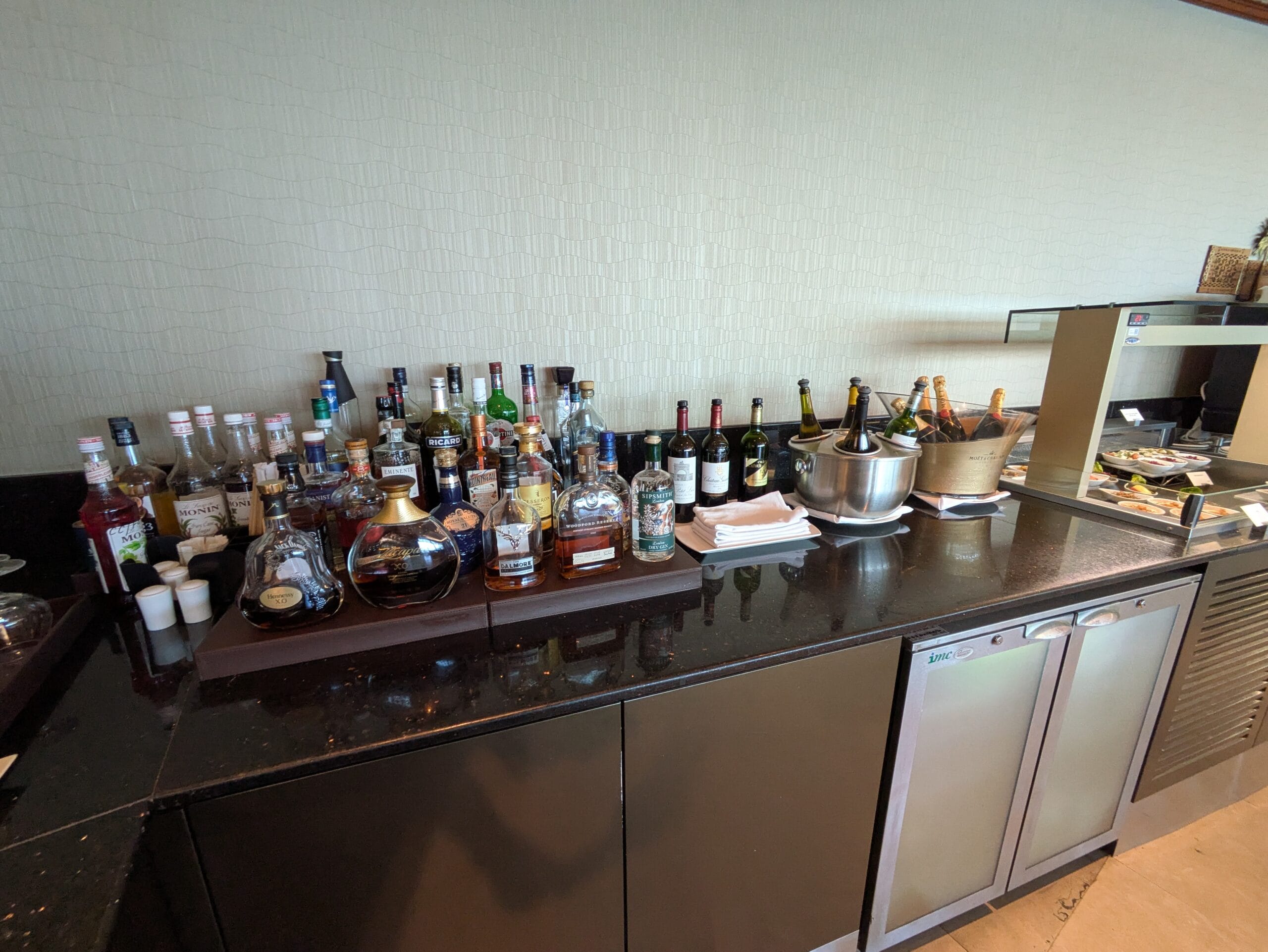 De alcoholselectie is ook hier uitgebreid. Naast het gebruikelijke aanbod aan sterk alcoholische dranken kun je hier weer verrassend goede wijnen vinden. De champagne is met Moët & Chandon de zwakste optie. Gelukkig maakt het ruime assortiment aan rode en witte wijnen dit allemaal goed. Ook in deze lounge lijken de flessen redelijk willekeurig te zijn neergezet en kun je op zoek naar wat lekkers.