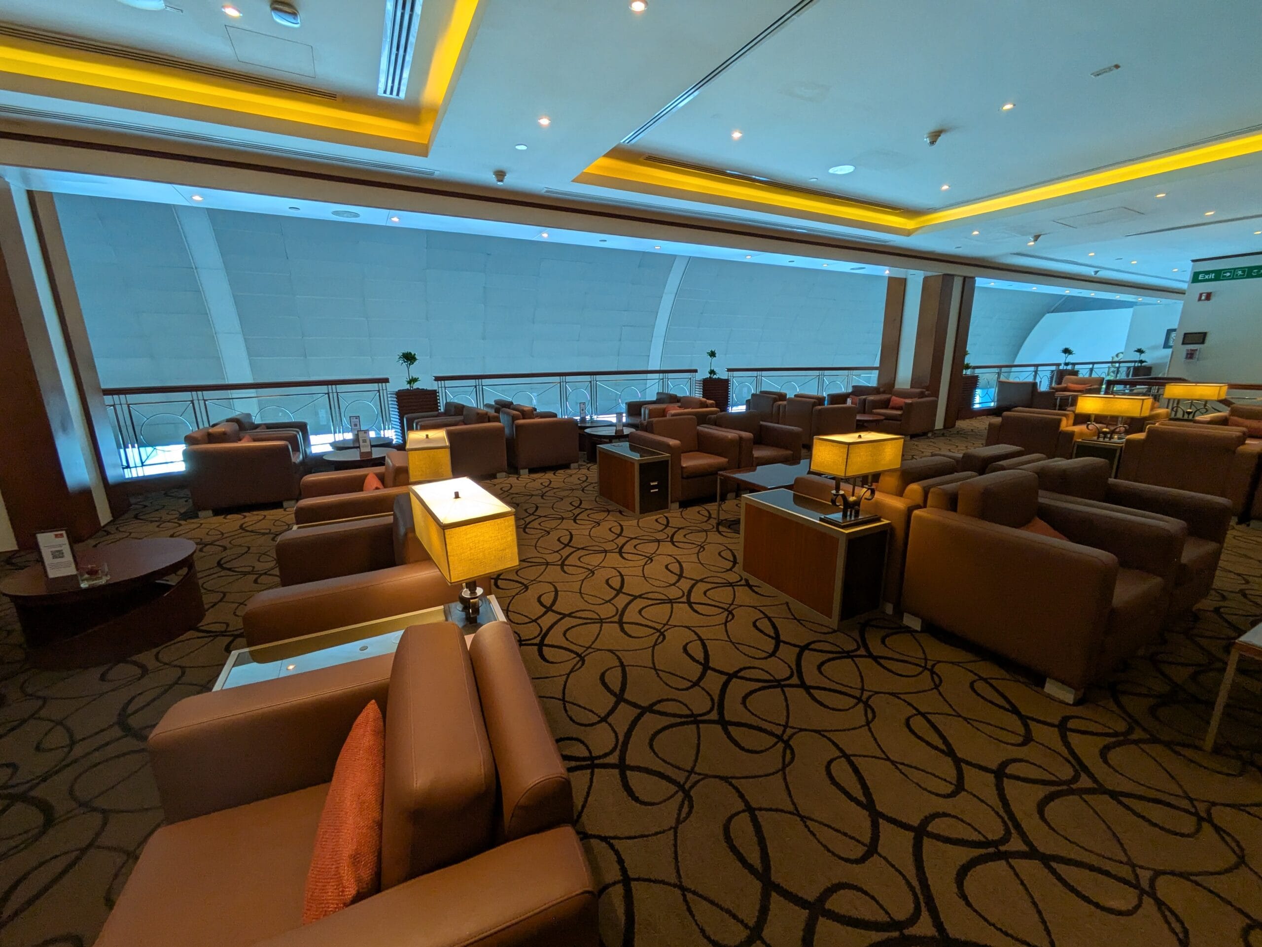 In het midden van de lounge is een trap naar de bovenverdieping van de lounge. Dit gedeelte bestaat hoofdzakelijk uit relaxstoelen. Je hebt hier een stuk minder licht, wat prettig kan zijn als je een flinke jetlag hebt. Achterin kun je nog wat eten vinden en uiteraard een assortiment aan drinken.