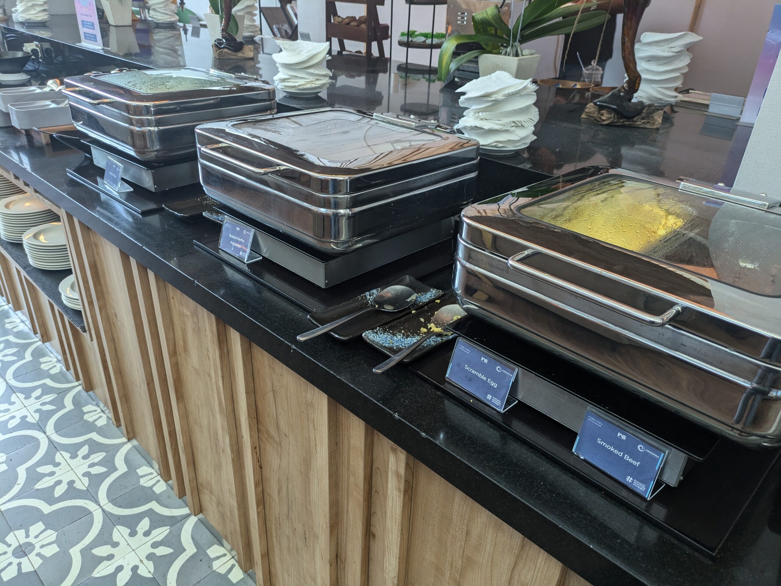 Op het gebied van eten is er ook voldoende te vinden in de lounge. Er is bubur-ayam, diverse rijstgerechten, roerei, etc. Dit is allemaal in de vorm van een buffet.