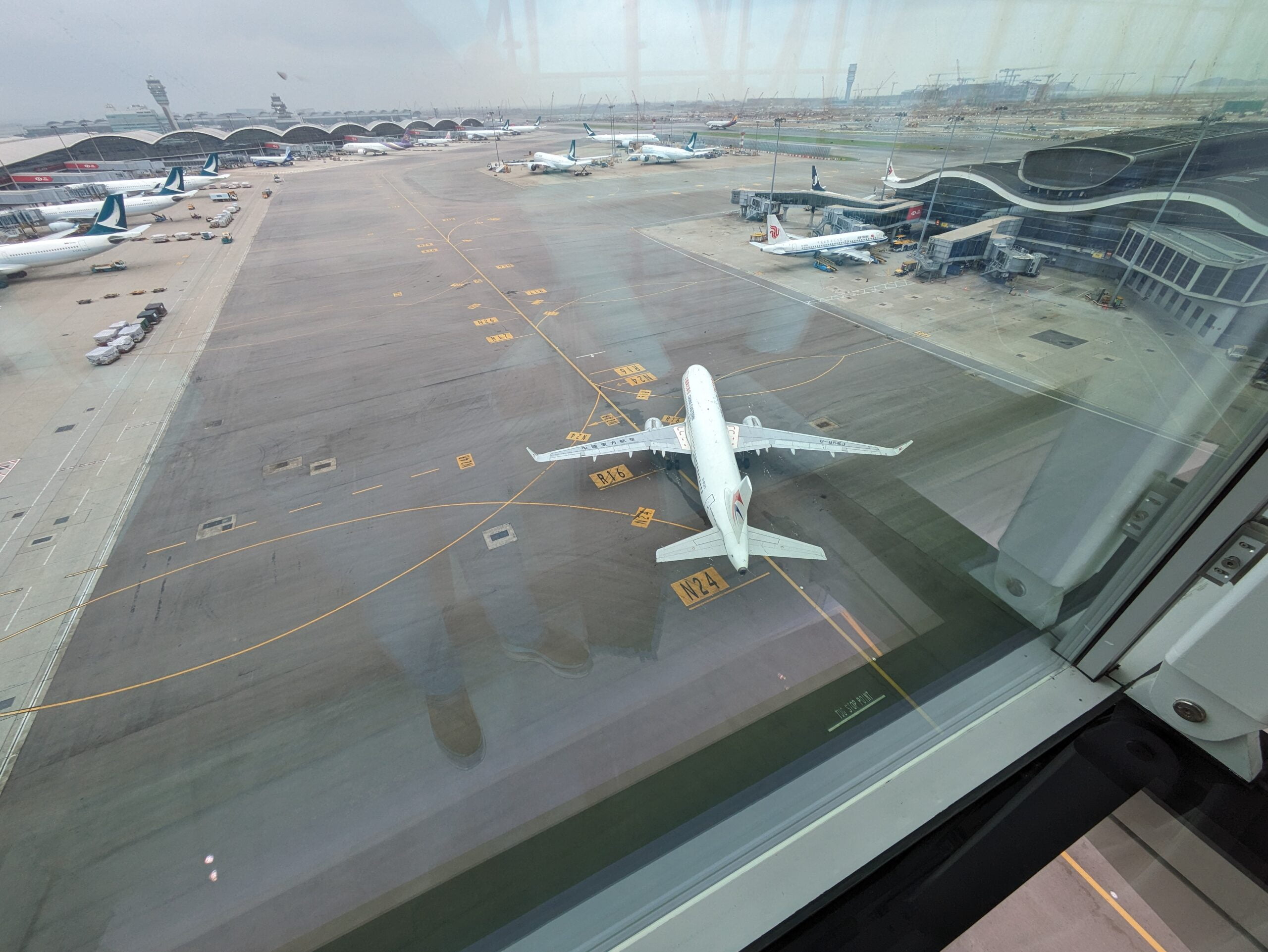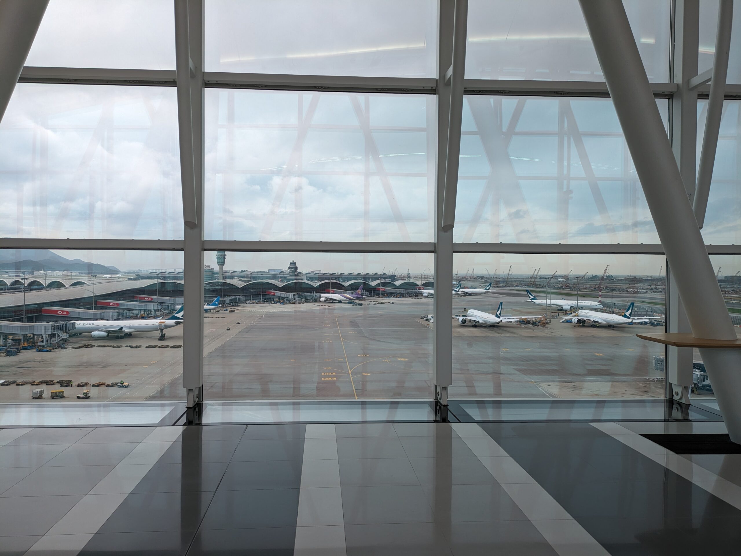 Vanaf hier heb je geweldig uitzicht over het platform van Hong Kong International Airport. Daarnaast kun je toestellen zien opstijgen.
