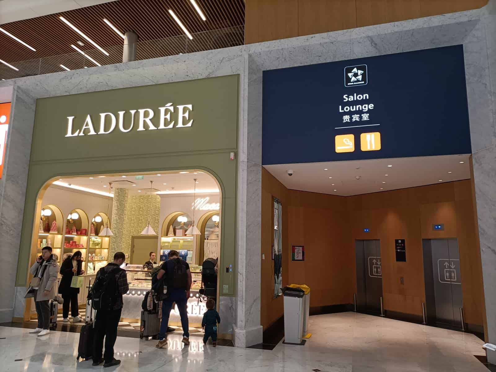 Nadat ik langs de paspoortcontrole en de beveiliging ben (en dat is geen pretje in Parijs) ga ik naar de Star Alliance lounge. Daarvoor moet ik richting gates 10-38. Naast een Ladurée winkel is de lift naar de lounge te vinden.