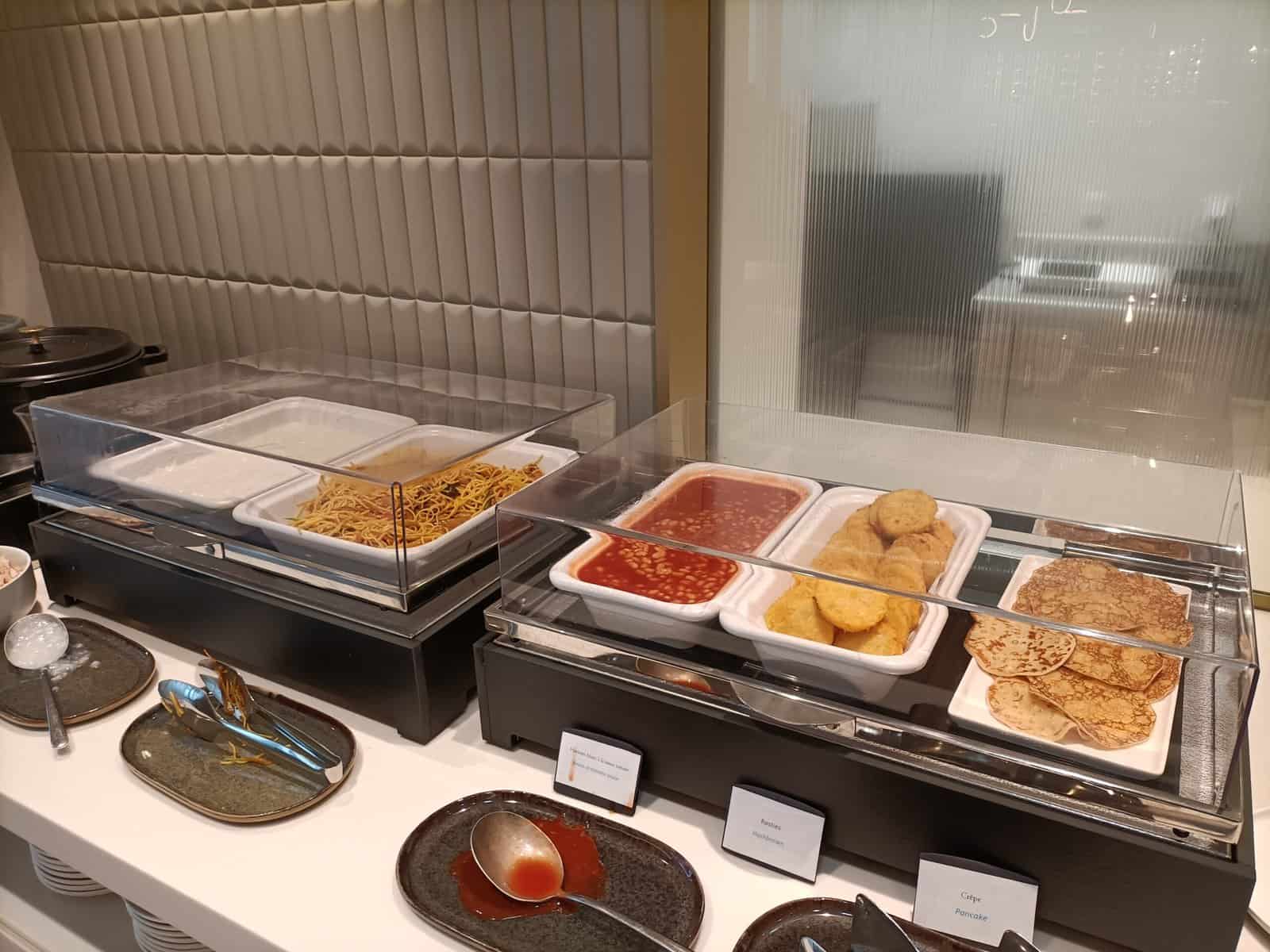 Pannenkoeken, noodles, hash browns, witte bonen in tomatensaus is ook aanwezig op het buffet.