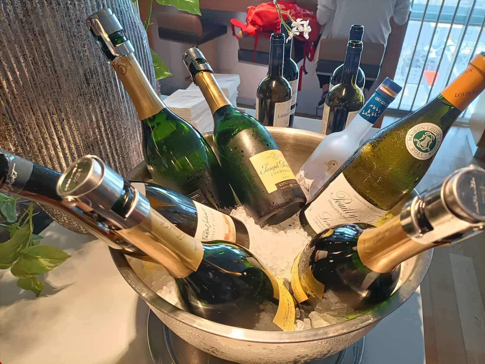Om de reis goed te beginnen is het tijd voor een glas champagne, vergezeld met een glas Perrier water.