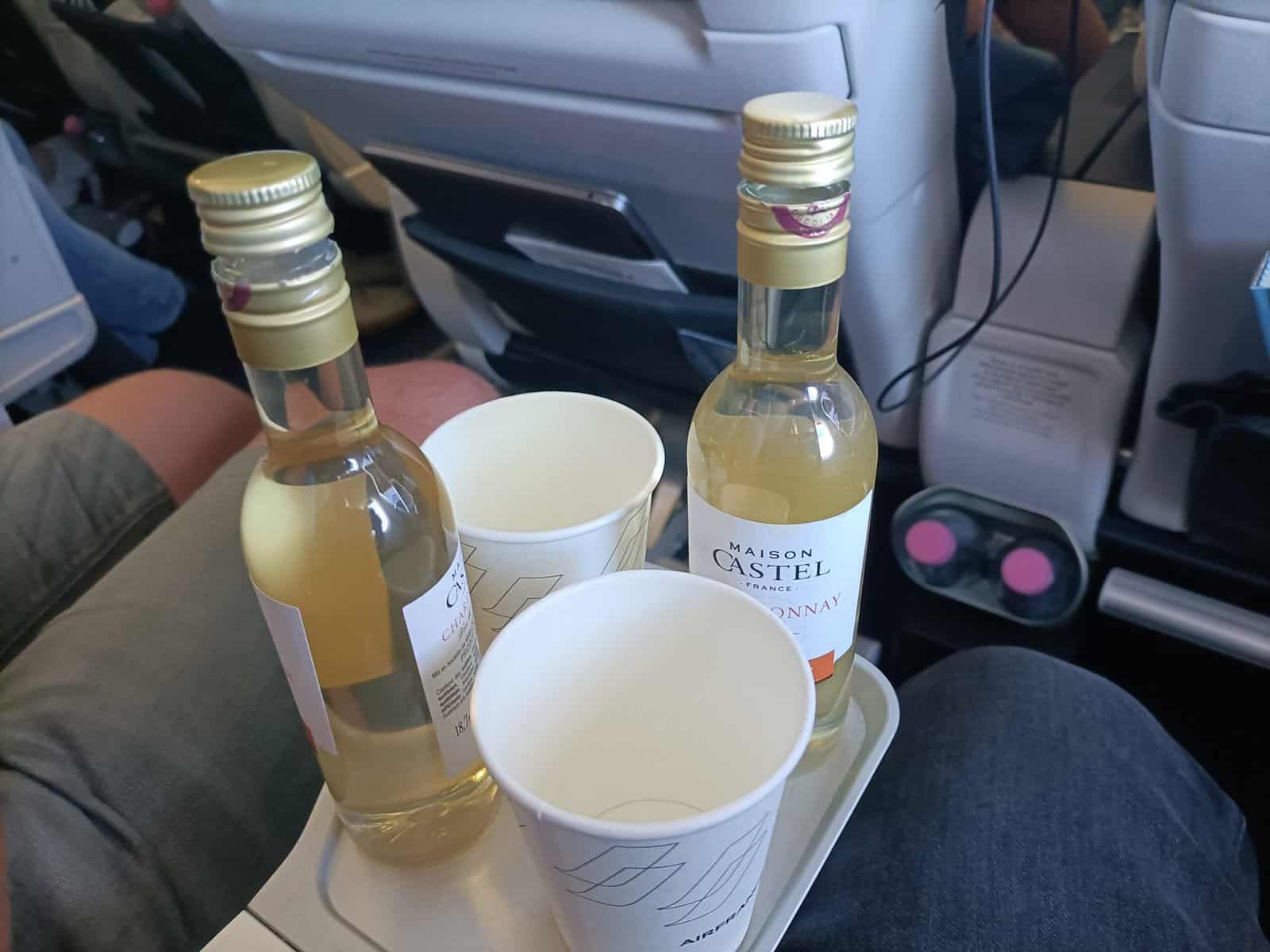 Ongeveer drie kwartier na het serveren van de hoofdmaaltijd komt de crew langs op de tray op te halen. Een tweede glas champagne is helaas niet mogelijk. Wel kan ik koffie, thee, cognac of rode wijn krijgen. Ik kies voor het laatste en Air France serveert dit met een papieren beker. Het gehele aanbod is vanaf nu exact gelijk aan het aanbod in de reguliere Economy Class.