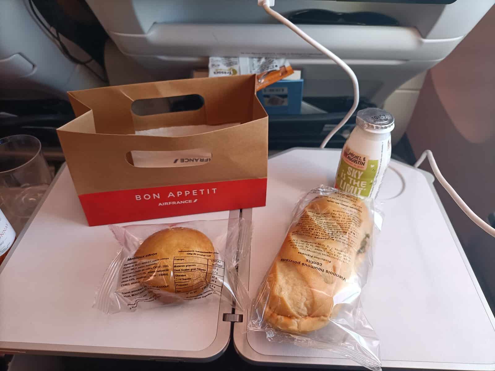 Ongeveer een uur en een kwartier voor aankomst op de luchthaven van Washington komt de crew met een tweede maaltijdronde. Alhoewel, maaltijd is een groot woord. Ook hier serveert Air France exact hetzelfde als in de reguliere Economy Class. De kwaliteit van de artikelen zijn slecht en bevatten voornamelijk snelle koolhydaten. En dus verdwijnt alles weer ongebruikt in het tasje….